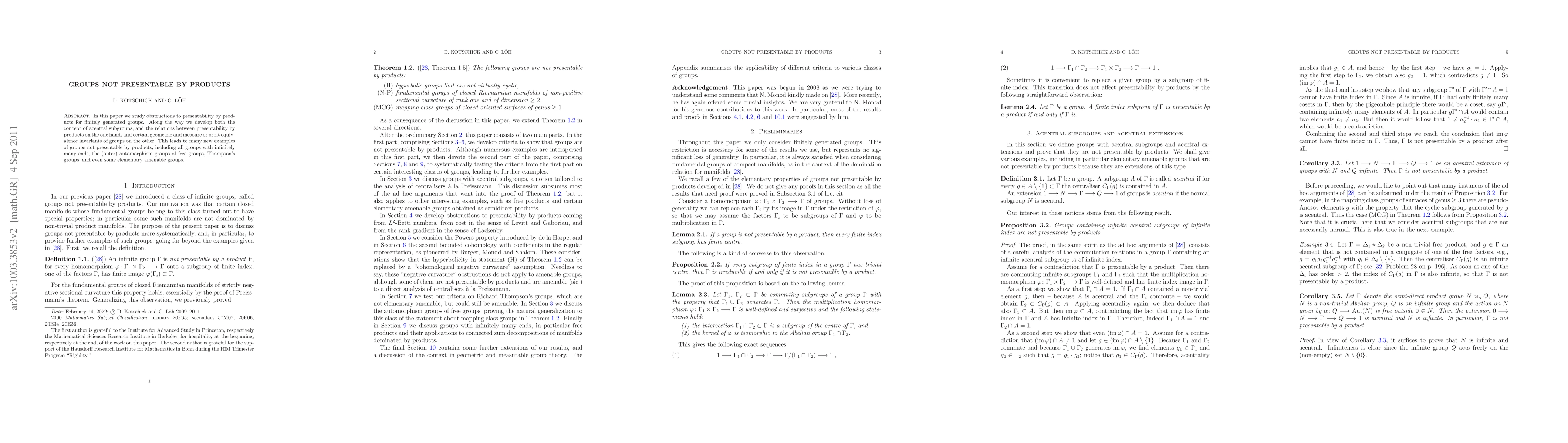 In this paper we study obstructions to presentability by products for finitely generated groups. Along the way we develop both the concept of acentral subgroups, and the relations between presentability by products on the one hand, and certain geometric and measure or orbit equivalence invariants of groups on the other. This leads to many new examples of groups not presentable by products, including all groups with infinitely many ends, the (outer) automorphism groups of free groups, Thompson's groups, and even some elementary amenable groups.