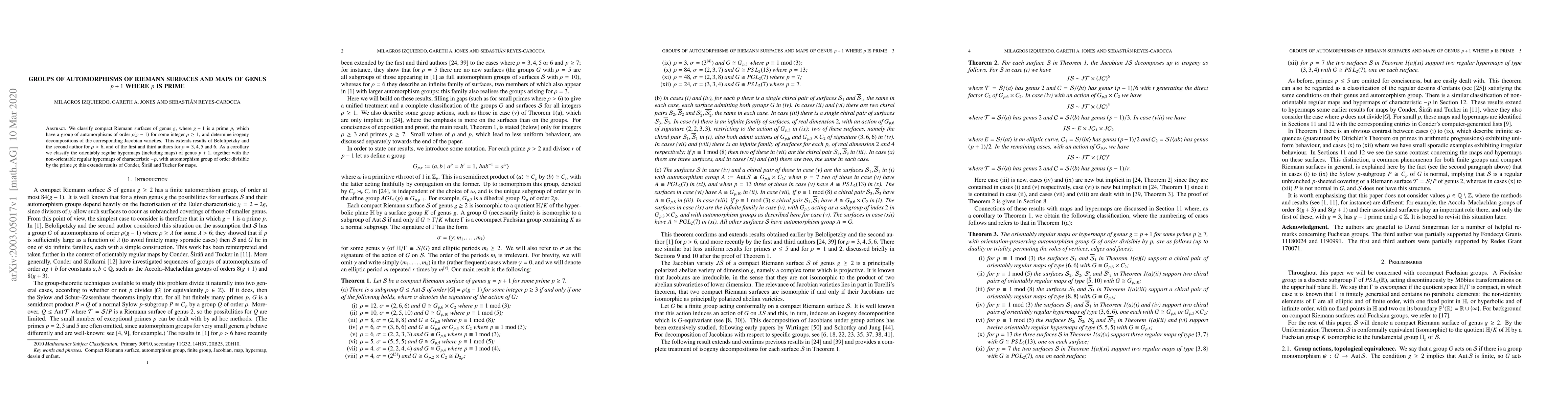 This paper classifies Riemann surfaces of genus $g=p+1$ with automorphism groups of order $\rho(p)$, determining their Jacobian isogeny decompositions and extending previous results for specific $\rho$ values. It also classifies orientably and non-orientably regular hypermaps with prime-divisible automorphism orders.