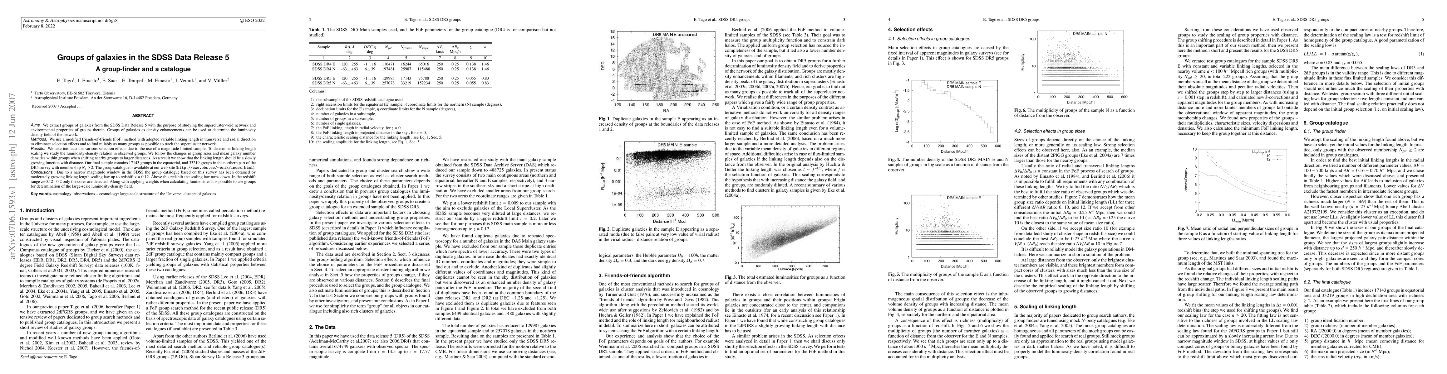 This study utilizes a modified friends-of-friends method to identify 50,362 galaxy groups from SDSS DR5 data, aiming to analyze the supercluster-void network and environmental properties. The resulting catalogue, available online, accounts for selection effects and adjusts linking lengths based on luminosity-density relations, revealing significant group characteristics up to redshift z=0.12.