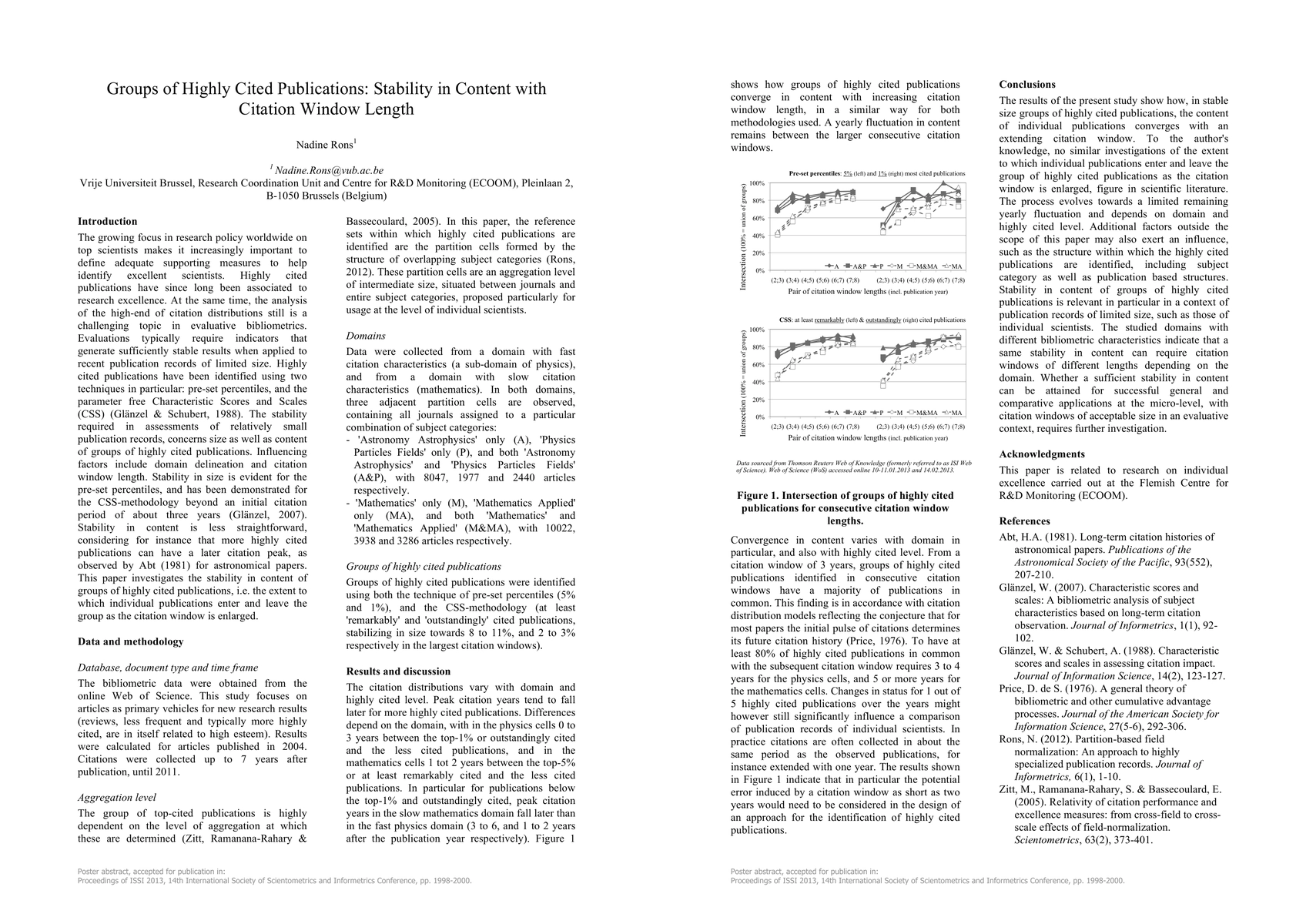 This paper examines the stability in content of highly cited publications over varying citation window lengths, assessing how often individual publications remain in or exit the group of highly cited works as the time frame for citation accumulation is extended. The study focuses on the implications for evaluating research excellence and the challenges in bibliometric analysis.