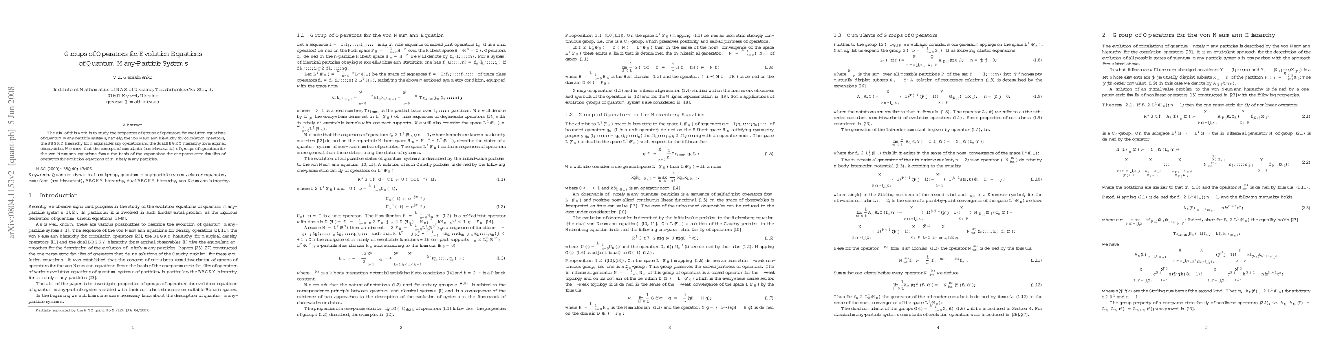 This paper investigates the properties of operator groups in quantum many-particle systems, focusing on the von Neumann, BBGKY, and dual BBGKY hierarchies. It demonstrates that cumulants of these operator groups underpin expansions for families of operators in the evolution equations of infinite particle systems.