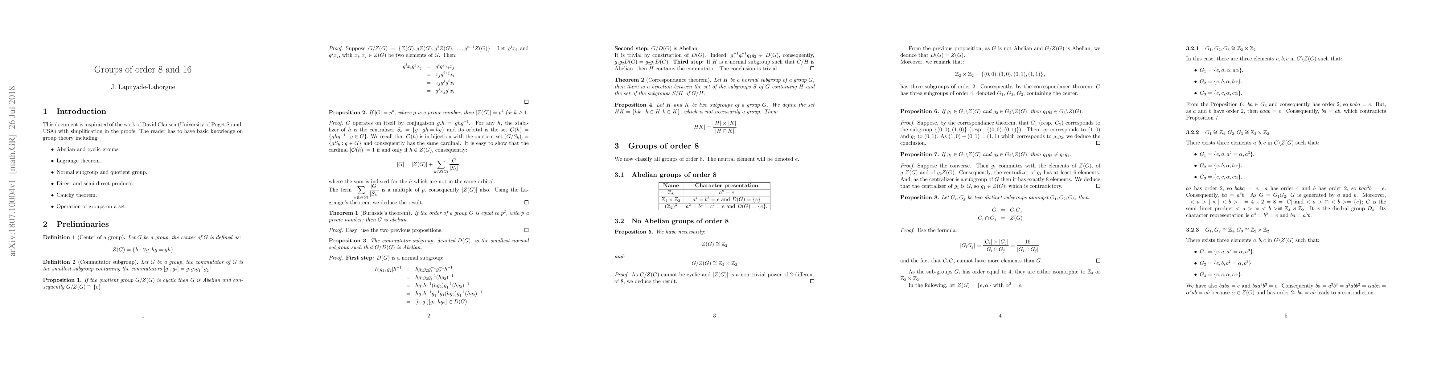 This document simplifies the classification of groups of order 8 and 16, correcting typographical errors found in David Clausen's original work and providing a clearer, more straightforward proof for the classification of groups of order 16.