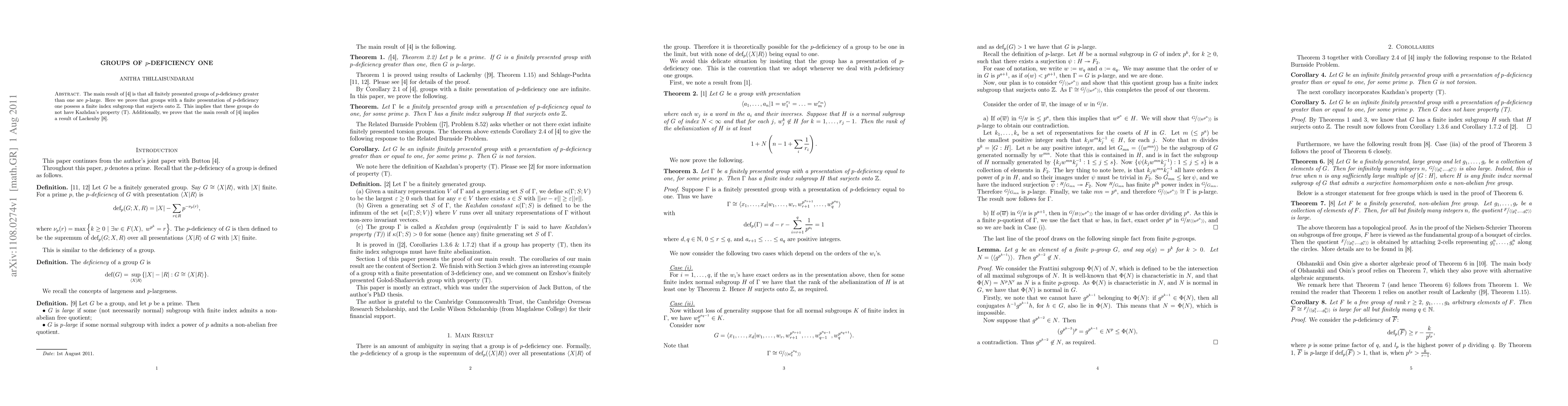 The main result of [4] is that all finitely presented groups of p-deficiency greater than one are p-large. Here we prove that groups with a finite presentation of p-deficiency one possess a finite index subgroup that surjects onto . This implies that these groups do not have Kazhdan's property (T). Additionally, we prove that the main result of [4] implies a result of Lackenby [8].