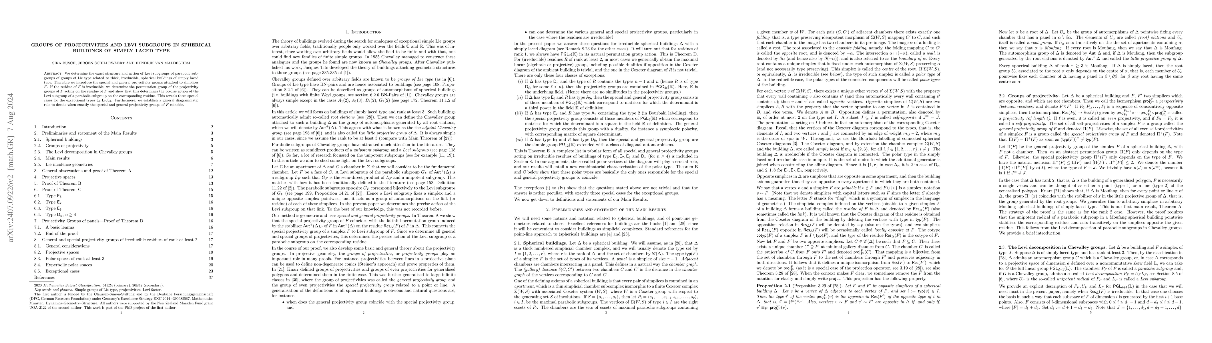 This research paper determines the structure and action of Levi subgroups in parabolic subgroups related to thick, irreducible spherical buildings of simply laced type, introducing special and general projectivity groups. It identifies the permutation group of projectivity groups acting on irreducible residues and reveals specific cases for exceptional types $E_6$, $E_7$, and $E_8$, alongside a diagrammatic rule for determining when these groups coincide.