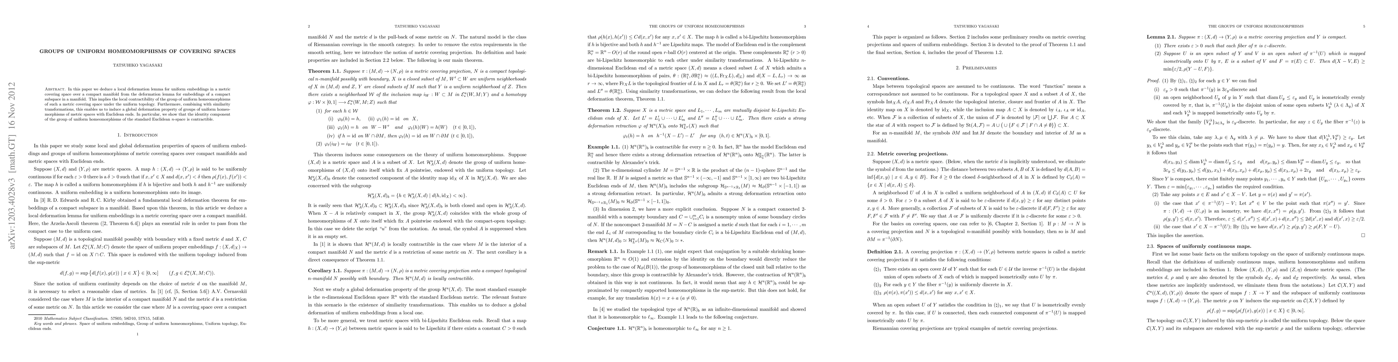 This paper establishes a local deformation lemma for uniform embeddings in metric covering spaces over compact manifolds, leading to the local contractibility of the group of uniform homeomorphisms under the uniform topology. It also demonstrates a global homotopy property for groups of uniform homeomorphisms of metric spaces with Euclidean ends, showing that the identity component of the group of uniform homeomorphisms in standard Euclidean n-space is contractible.