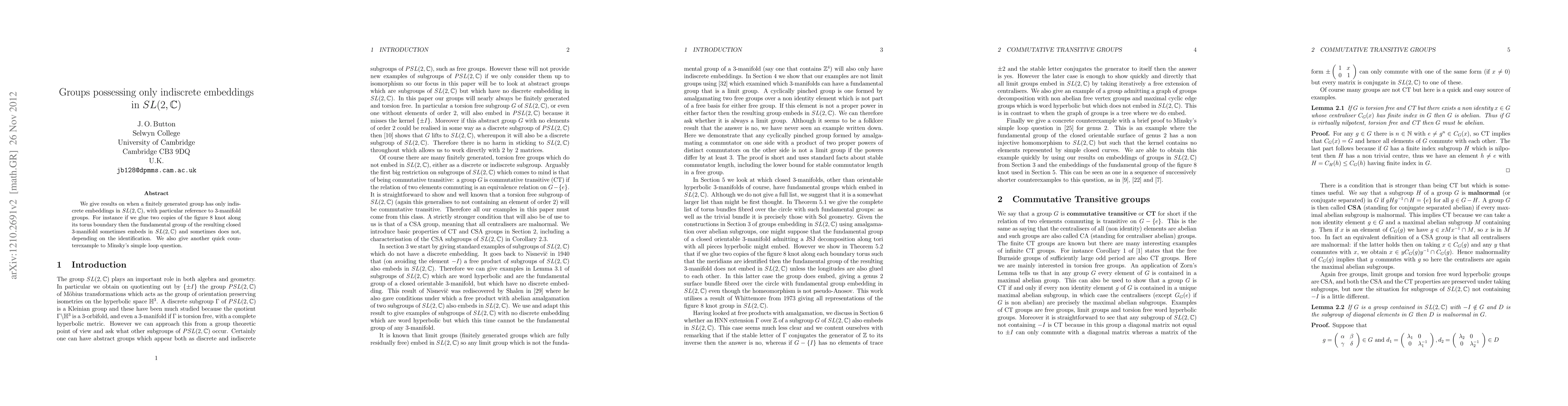 We give results on when a finitely generated group has only indiscrete embeddings in SL(2,C), with particular reference to 3-manifold groups. For instance if we glue two copies of the figure 8 knot along its torus boundary then the fundamental group of the resulting closed 3-manifold sometimes embeds in SL(2,C) and sometimes does not, depending on the identification. We also give another quick counterexample to Minsky's simple loop question.
