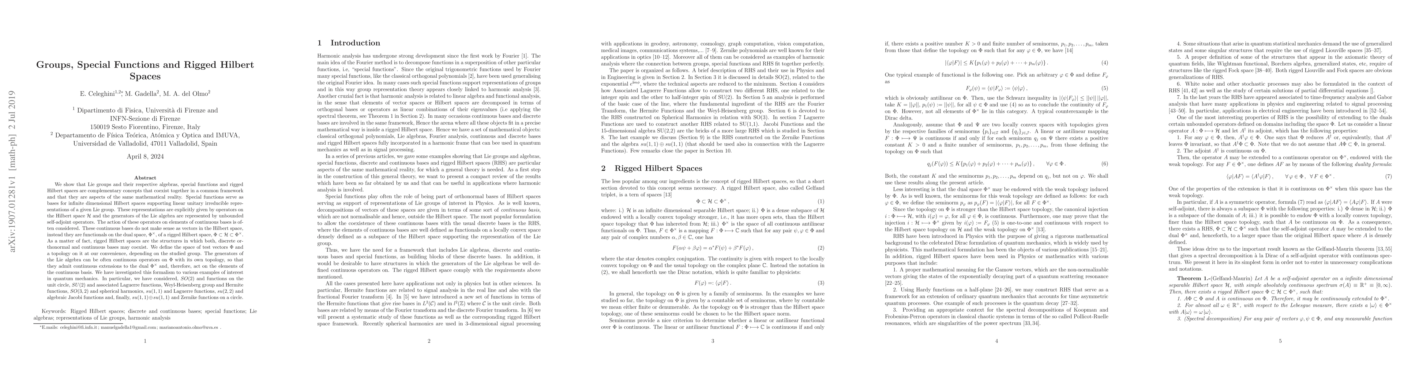 This paper explores the interconnectedness of Lie groups, their algebras, special functions, and rigged Hilbert spaces, demonstrating how they form a unified mathematical framework. Special functions serve as bases for infinite-dimensional Hilbert spaces, supporting representations of Lie groups, while rigged Hilbert spaces provide the structure for both discrete and continuous bases.