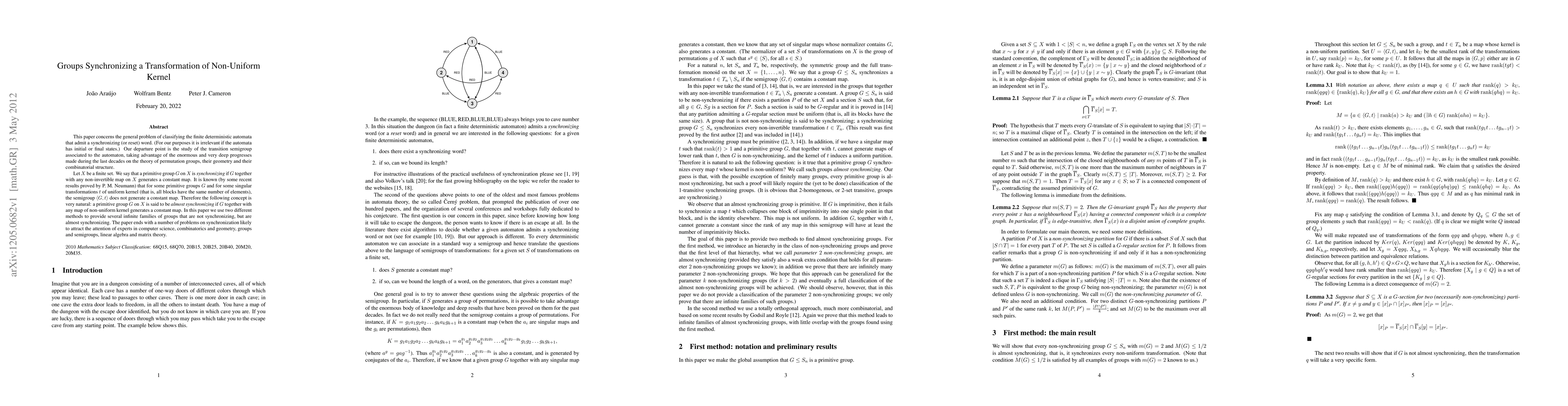 This paper classifies finite deterministic automata admitting synchronizing words by studying the transition semigroup associated with them. It introduces the concept of "almost synchronizing" groups that generate constant maps with any non-uniform kernel transformation, providing several infinite families of such groups and posing open problems for experts in various fields.