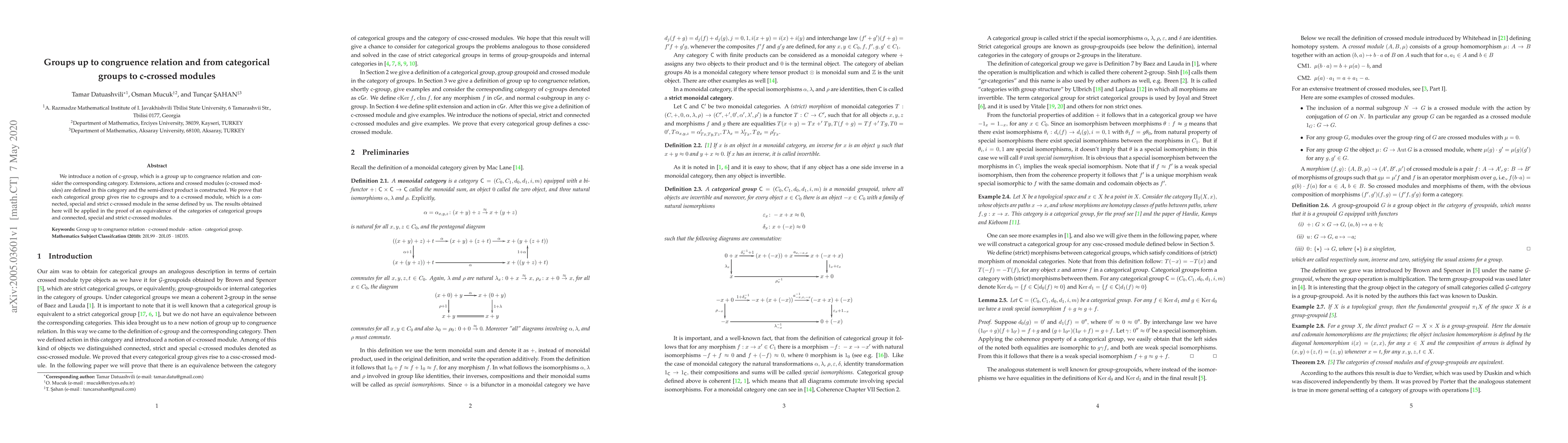 We introduce a notion of c-group, which is a group up to congruence relation and consider the corresponding category. Extensions, actions and crossed modules (c-crossed modules) are defined in this category and the semi-direct product is constructed. We prove that each categorical group gives rise to c-groups and to a c-crossed module, which is a connected, special and strict c-crossed module in the sense defined by us. The results obtained here will be applied in the proof of an equivalence of the categories of categorical groups and connected, special and strict c-crossed modules.