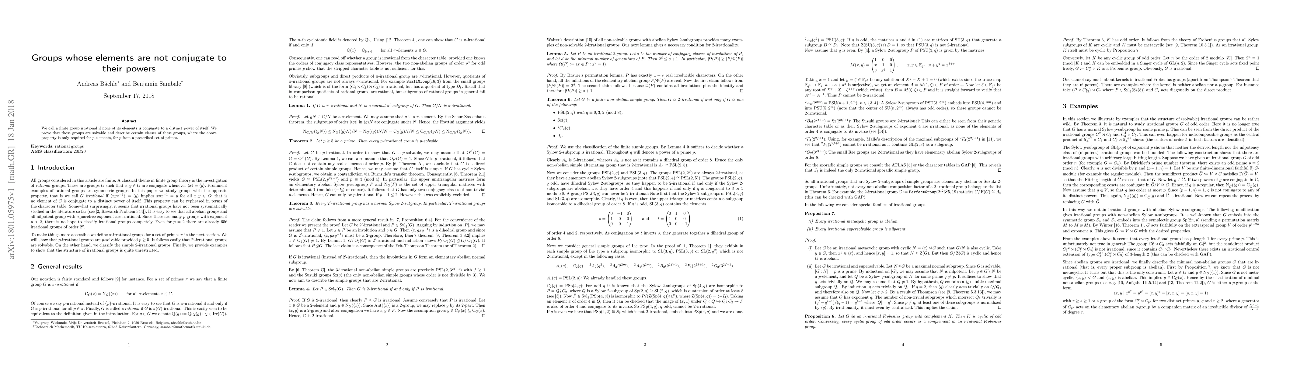 We call a finite group irrational if none of its elements is conjugate to a distinct power of itself. We prove that those groups are solvable and describe certain classes of these groups, where the above property is only required for $p$-elements, for $p$ from a prescribed set of primes.