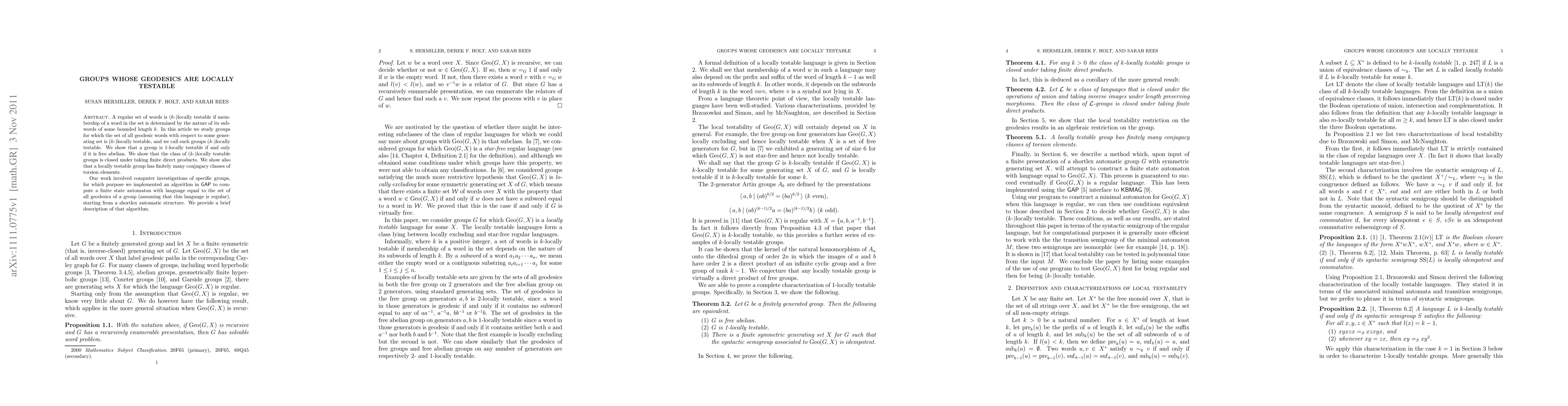 A regular set of words is ($k$-)locally testable if membership of a word in the set is determined by the nature of its subwords of some bounded length $k$. In this article we study groups for which the set of all geodesic words with respect to some generating set is ($k$-)locally testable, and we call such groups ($k$-)locally testable. We show that a group is \klt{1} if and only if it is free abelian. We show that the class of ($k$-)locally testable groups is closed under taking finite direct products. We show also that a locally testable group has finitely many conjugacy classes of torsion elements. Our work involved computer investigations of specific groups, for which purpose we implemented an algorithm in \GAP\ to compute a finite state automaton with language equal to the set of all geodesics of a group (assuming that this language is regular), starting from a shortlex automatic structure. We provide a brief description of that algorithm.