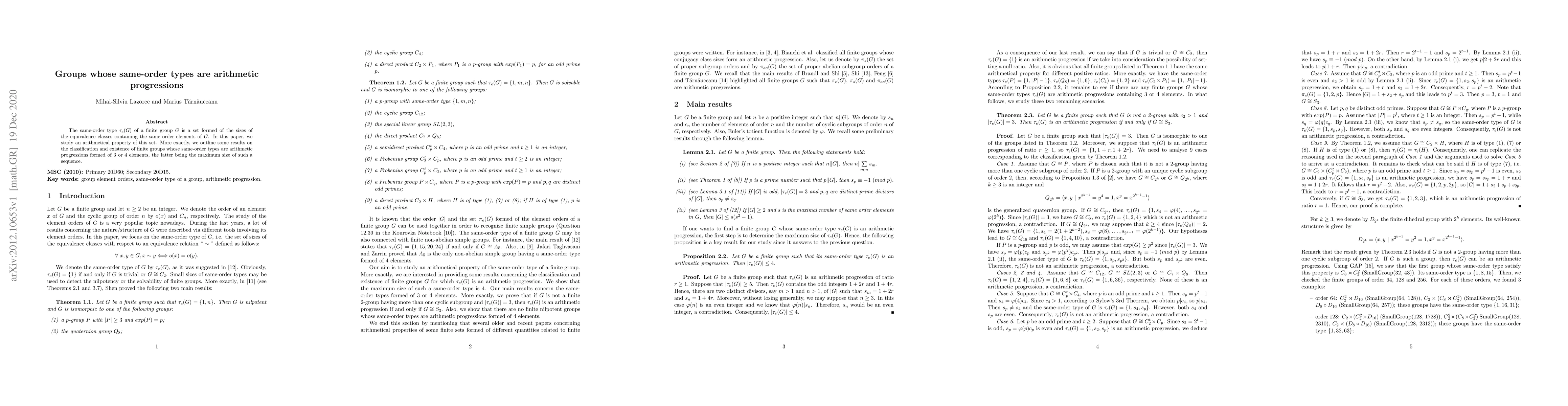 The same-order type $\tau_e(G)$ of a finite group $G$ is a set formed of the sizes of the equivalence classes containing the same order elements of $G$. In this paper, we study an arithmetical property of this set. More exactly, we outline some results on the classification and existence of finite groups whose same-order types are arithmetic progressions formed of 3 or 4 elements, the latter being the maximum size of such a sequence.