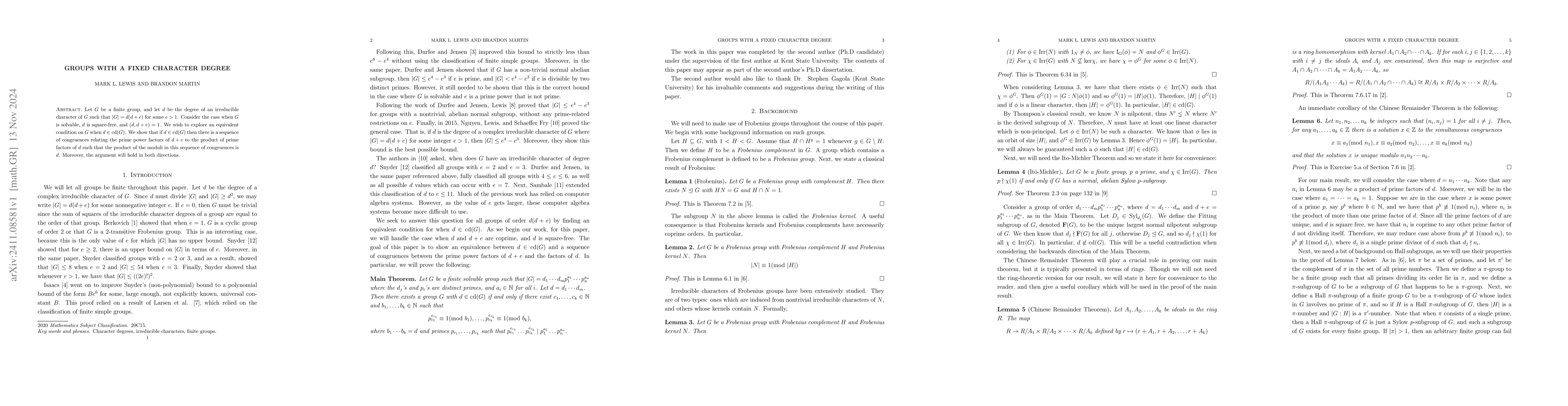 Let $G$ be a finite group, and let $d$ be the degree of an irreducible character of $G$ such that $|G|=d(d+e)$ for some $e>1$. Consider the case when $G$ is solvable, $d$ is square-free, and $(d,d+e)=1$. We wish to explore an equivalent condition on $G$ when $d\in\text{cd}(G)$. We show that if $d\in\text{cd}(G)$ then there is a sequence of congruences relating the prime power factors of $d+e$ to the product of prime factors of $d$ such that the product of the moduli in this sequence of congruences is $d$. Moreover, the argument will hold in both directions.
