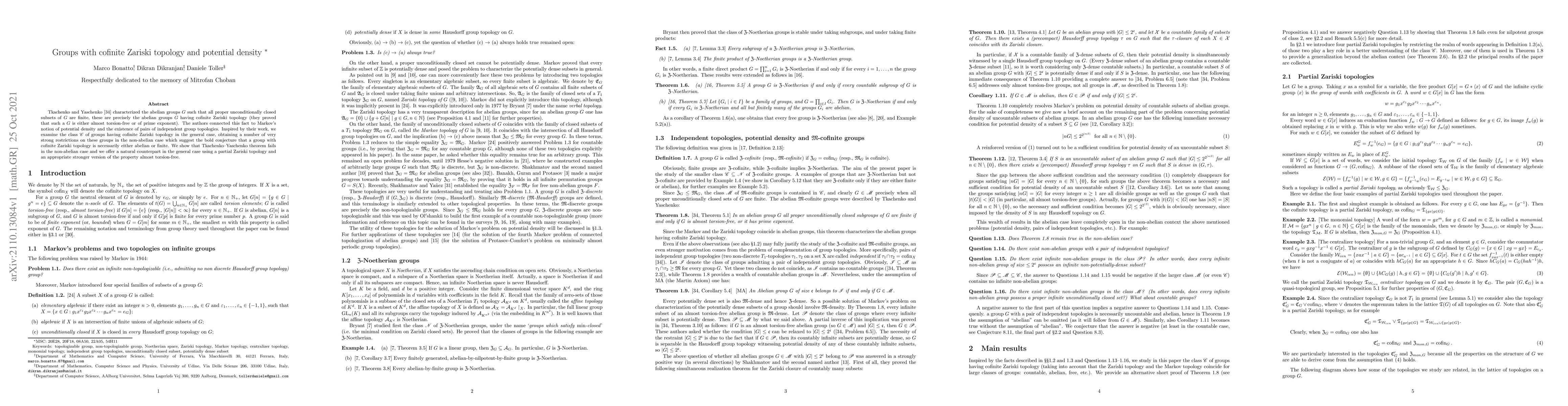 Tkachenko and Yaschenko [34] characterized the abelian groups G such that all proper unconditionally closed subsets of G are finite, these are precisely the abelian groups G having cofinite Zariski topology (they proved that such a G is either almost torsion-free or of prime exponent). The authors connected this fact to Markov's notion of potential density and the existence of pairs of independent group topologies. Inspired by their work, we examine the class C of groups having cofinite Zariski topology in the general case, obtaining a number of very strong restrictions on these groups in the non-abelian case which suggest the bold conjecture that a group with cofinite Zariski topology is necessarily either abelian or finite. We show that Tkachenko-Yaschenko theorem fails in the non-abelian case and we offer a natural counterpart in the general case using a partial Zariski topology and an appropriate stronger version of the property almost torsion-free.