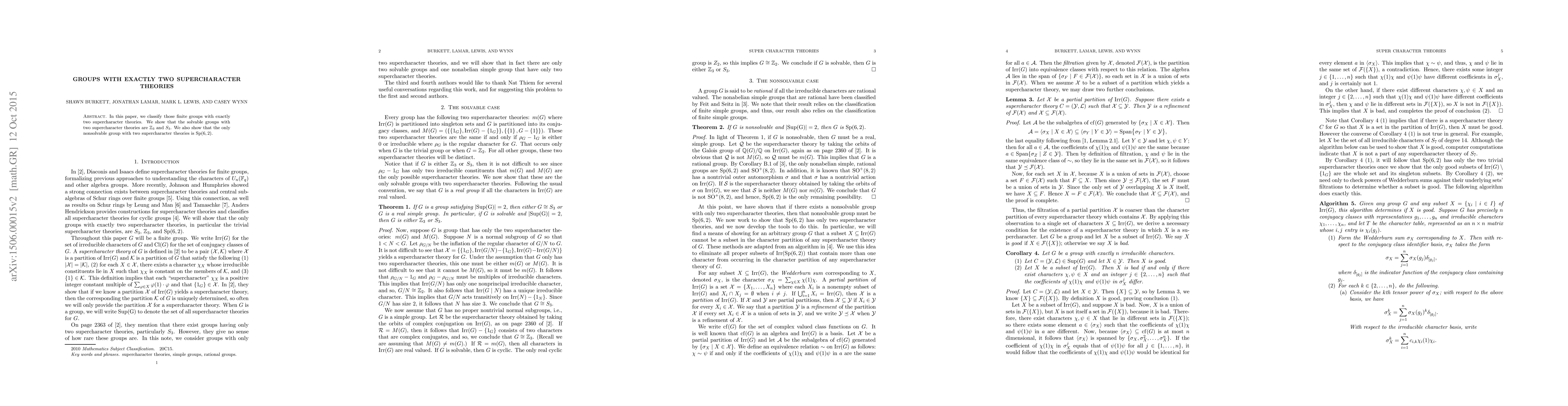 Summary: This paper classifies finite groups possessing exactly two supercharacter theories, revealing that $\mathbb{Z}_3$ and $S_3$ are solvable examples, while ${\rm Sp} (6,2)$ is the sole nonsolvable instance.