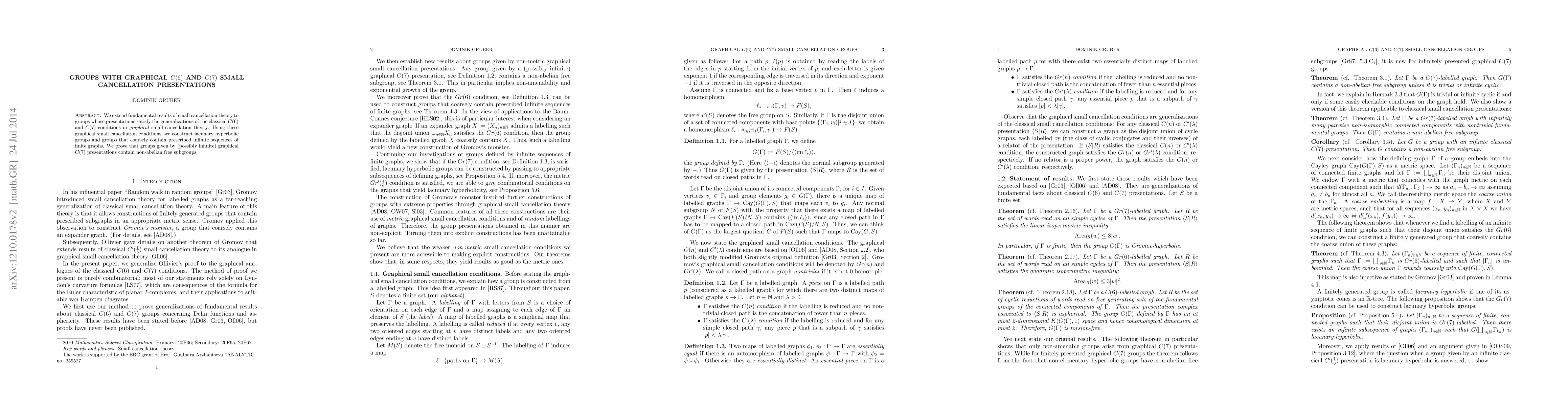 We extend fundamental results of small cancellation theory to groups whose presentations satisfy the generalizations of the classical C(6) and C(7) conditions in graphical small cancellation theory. Using these graphical small cancellation conditions, we construct lacunary hyperbolic groups and groups that coarsely contain prescribed infinite sequences of finite graphs. We prove that groups given by (possibly infinite) graphical C(7) presentations contain non-abelian free subgroups.