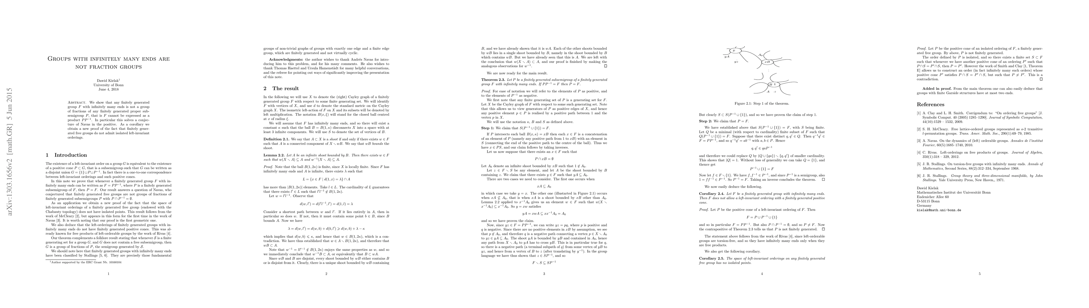 This paper demonstrates that finitely generated groups with infinitely many ends cannot be expressed as groups of fractions of any finitely generated proper subsemigroup, solving a conjecture by Navas. Additionally, it provides a new proof that finitely generated free groups do not admit isolated left-invariant orderings.