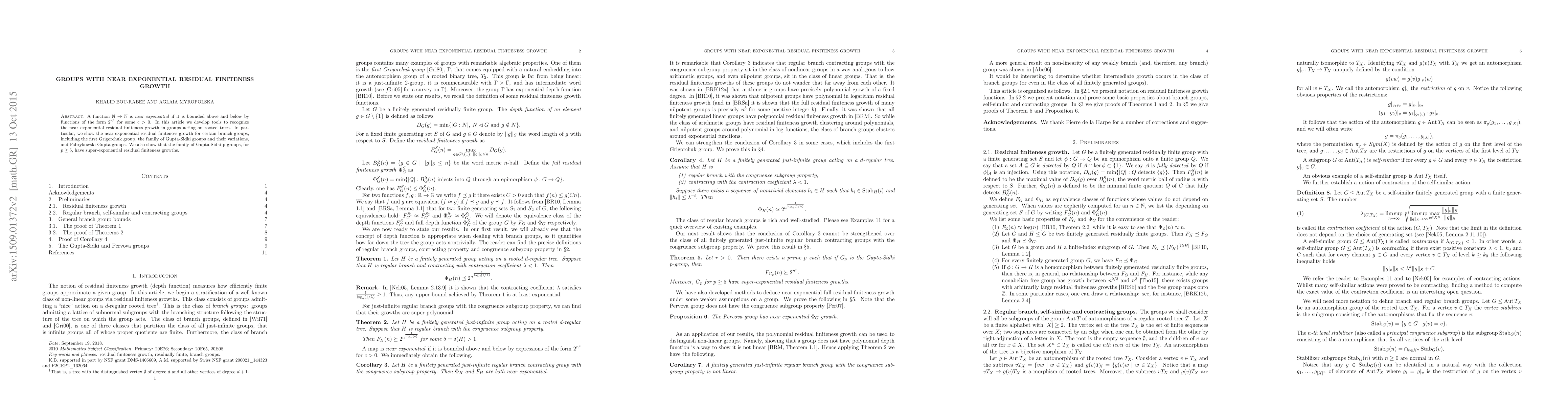 The paper develops tools to recognize near exponential residual finiteness growth in groups acting on rooted trees, focusing on branch groups such as the first Grigorchuk group, Gupta-Sidki groups, and Fabrykowski-Gupta groups.