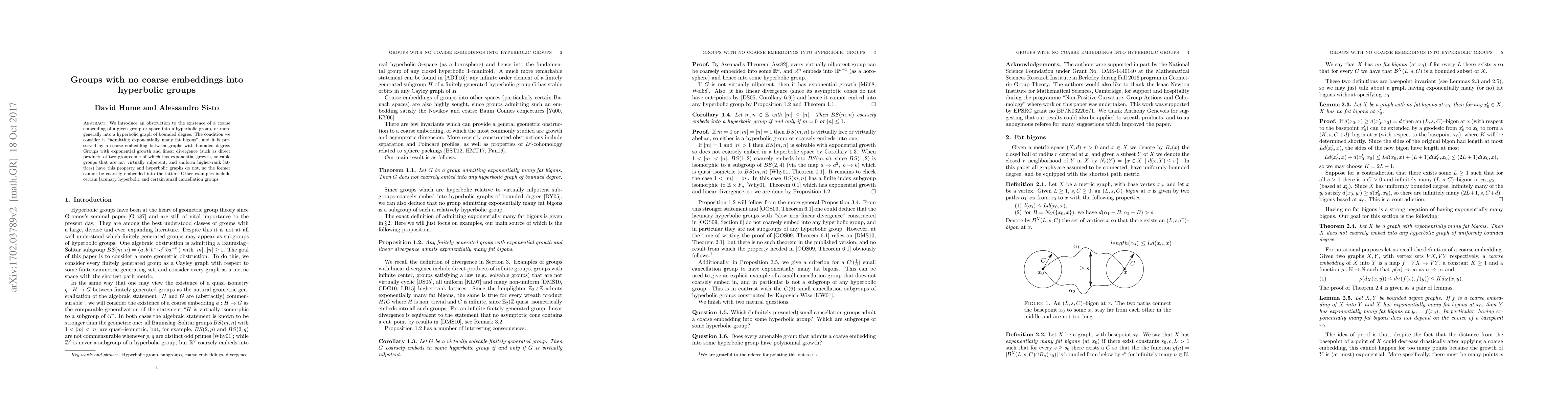 We introduce an obstruction to the existence of a coarse embedding of a given group or space into a hyperbolic group, or more generally into a hyperbolic graph of bounded degree. The condition we consider is "admitting exponentially many fat bigons", and it is preserved by a coarse embedding between graphs with bounded degree. Groups with exponential growth and linear divergence (such as direct products of two groups one of which has exponential growth, solvable groups that are not virtually nilpotent, and uniform higher-rank lattices) have this property and hyperbolic graphs do not, so the former cannot be coarsely embedded into the latter. Other examples include certain lacunary hyperbolic and certain small cancellation groups.