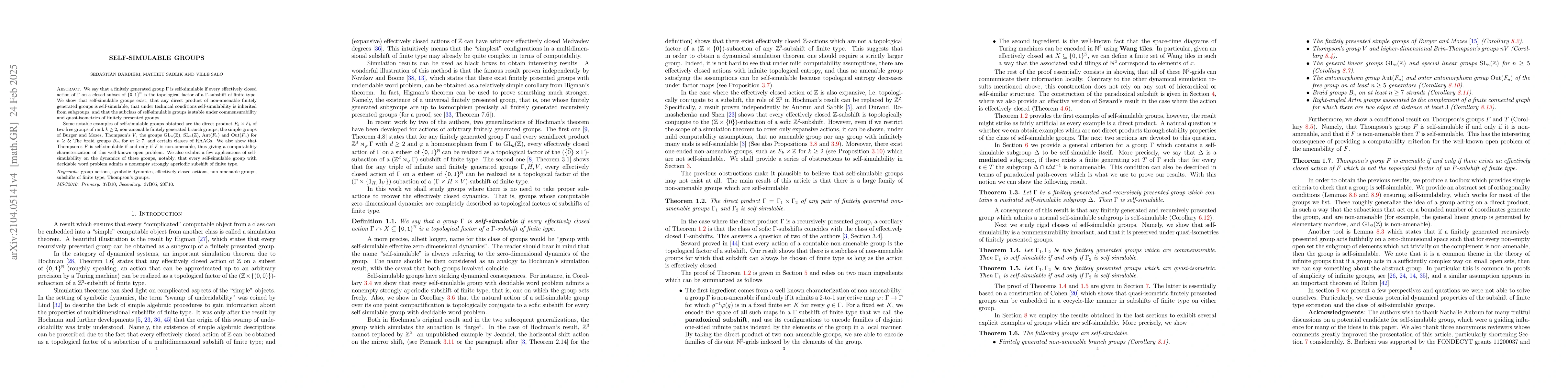 This paper explores the concept of self-simulable groups, demonstrating that direct products of non-amenable finitely generated groups exhibit this property. Key examples include free groups, branch groups, and various linear and automorphism groups, with notable applications to the dynamics of these groups.
