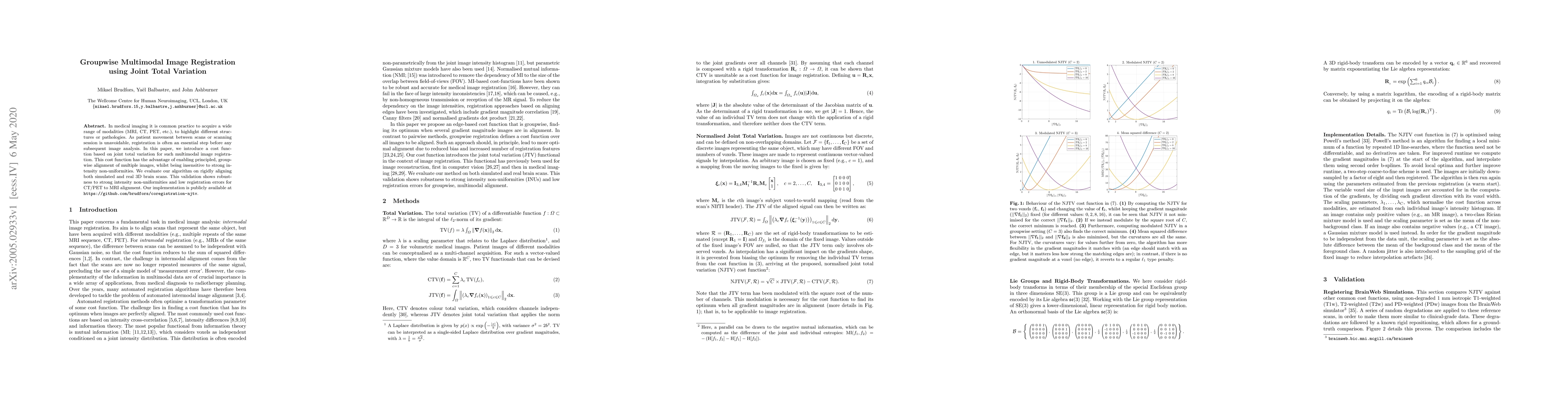 This paper presents a joint total variation cost function for groupwise multimodal image registration, enabling robust alignment of multiple images despite strong intensity non-uniformities. The method is validated on both simulated and real 3D brain scans, demonstrating low registration errors for aligning CT/PET to MRI images.