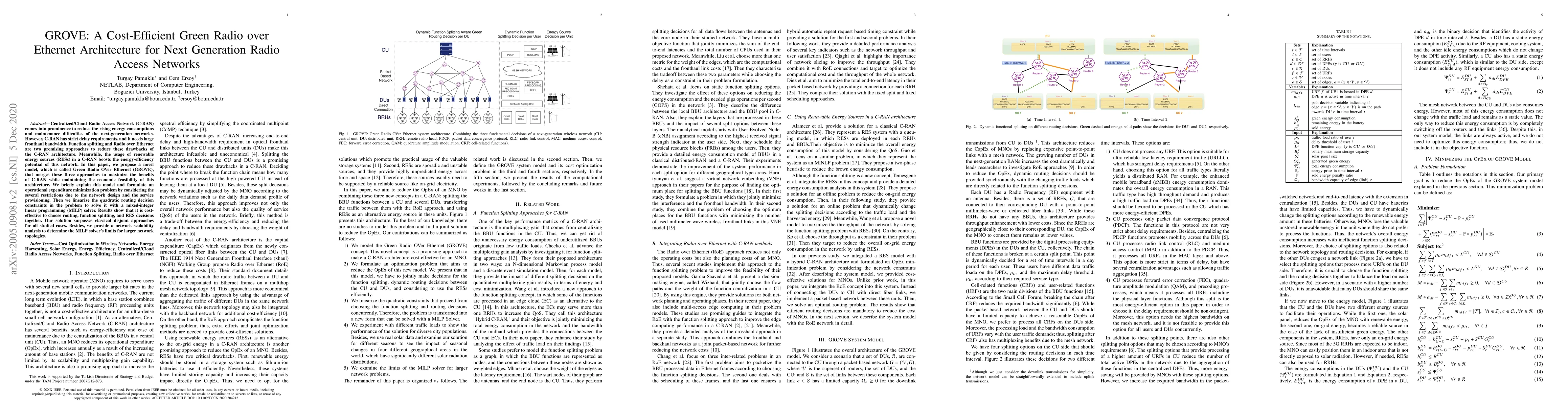 The paper proposes GROVE, a cost-efficient Green Radio over Ethernet architecture for next-generation C-RAN, combining function splitting, Radio over Ethernet, and renewable energy sources to optimize energy efficiency and maintain economic feasibility. The model is solved using MILP to minimize operational costs, demonstrating superior performance over traditional methods.