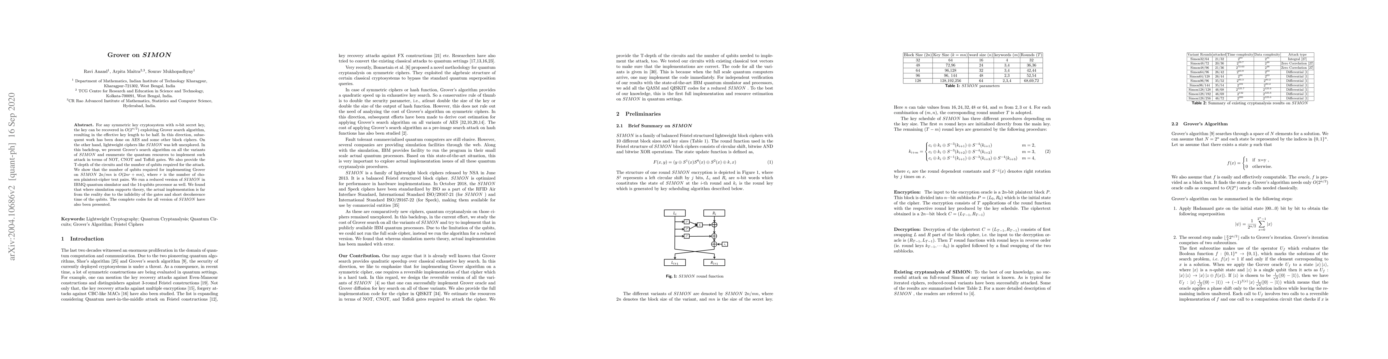 For any symmetric key cryptosystem with $n$-bit secret key, the key can be recovered in $O(2^{n/2})$ exploiting Grover search algorithm, resulting in the effective key length to be half. In this direction, subsequent work has been done on AES and some other block ciphers. On the other hand, lightweight ciphers like SIMON was left unexplored. In this backdrop, we present Grover's search algorithm on all the variants of SIMON and enumerate the quantum resources to implement such attack in terms of NOT, CNOT and Toffoli gates. We also provide the T-depth of the circuits and the number of qubits required for the attack. We show that the number of qubits required for implementing Grover on SIMON $2n/mn$ is $O(2nr+mn)$, where $r$ is the number of chosen plaintext-cipher text pairs. We run a reduced version of SIMON in IBMQ quantum simulator and the 14-qubits processor as well. We found that where simulation supports theory, the actual implementation is far from the reality due to the infidelity of the gates and short decoherence time of the qubits. The complete codes for all version of SIMON have also been presented.