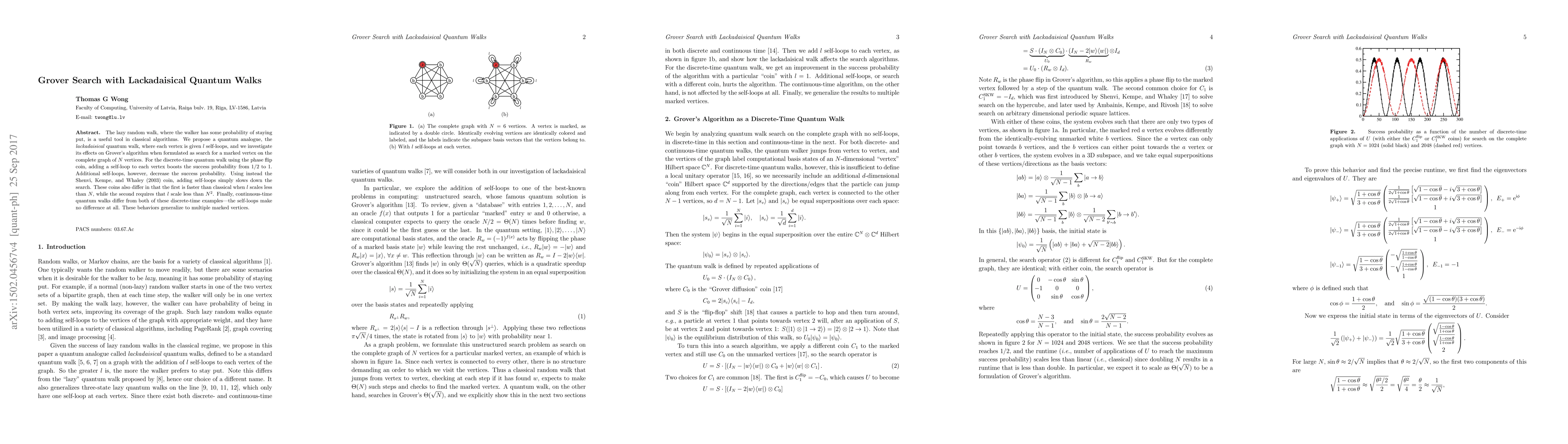 The paper introduces lackadaisical quantum walks and analyzes their effects on Grover's search algorithm for marked vertices in complete graphs, distinguishing between different types of quantum walk coins.