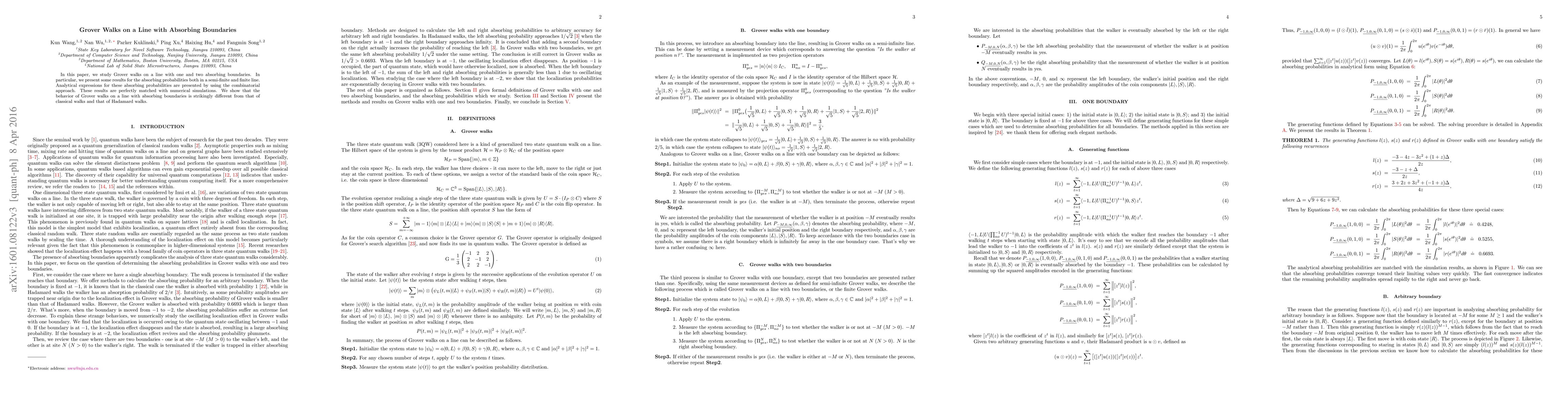 This paper explores Grover walks on a line with one or two absorbing boundaries, presenting analytical expressions for absorbing probabilities using a combinatorial approach. The results differ significantly from classical and Hadamard walks, as confirmed by numerical simulations.
