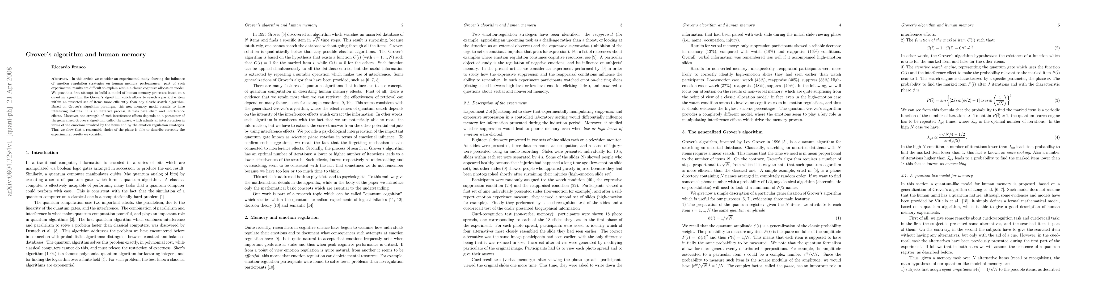 A new memory model based on Grover's algorithm helps explain human memory performance influenced by emotion regulation strategies, using parallelism and interference effects to describe experimental results.