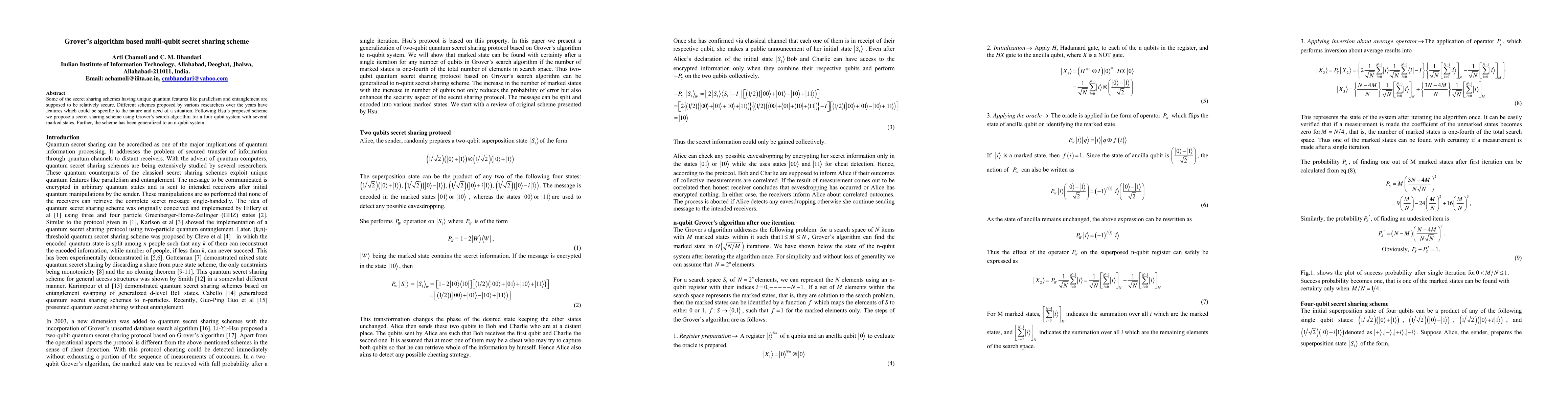 Some of the secret sharing schemes having unique quantum features like parallelism and entanglement are supposed to be relatively secure. Different schemes proposed by various researchers over the years have features which could be specific to the nature and need of a situation. Following Hsu's proposed scheme we propose a secret sharing scheme using Grover's search algorithm for a four qubit system with several marked states. Further, the scheme has been generalised to an n-qubit syatem.