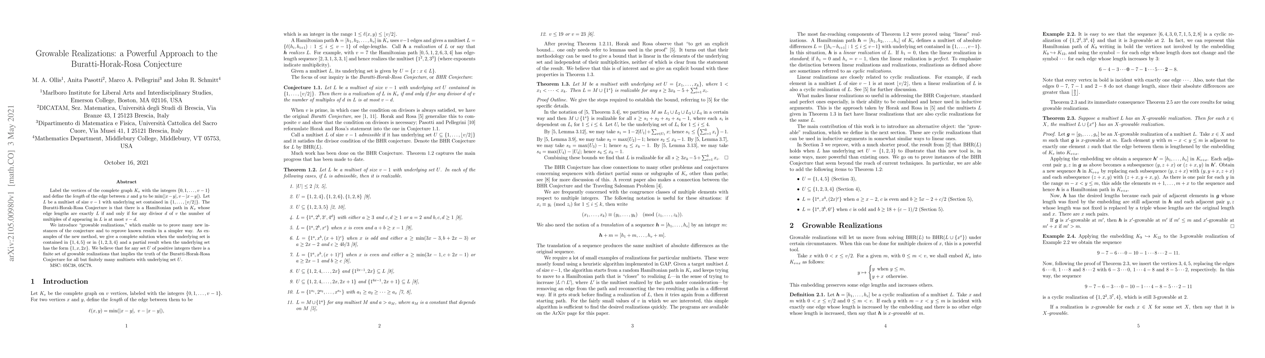 Label the vertices of the complete graph $K_v$ with the integers $\{ 0, 1, \ldots, v-1 \}$ and define the length of the edge between $x$ and $y$ to be $\min( |x-y| , v - |x-y| )$. Let $L$ be a multiset of size $v-1$ with underlying set contained in $\{ 1, \ldots, \lfloor v/2 \rfloor \}$. The Buratti-Horak-Rosa Conjecture is that there is a Hamiltonian path in $K_v$ whose edge lengths are exactly $L$ if and only if for any divisor $d$ of $v$ the number of multiples of $d$ appearing in $L$ is at most $v-d$. We introduce "growable realizations," which enable us to prove many new instances of the conjecture and to reprove known results in a simpler way. As examples of the new method, we give a complete solution when the underlying set is contained in $\{ 1,4,5 \}$ or in $\{ 1,2,3,4 \}$ and a partial result when the underlying set has the form $\{ 1, x, 2x \}$. We believe that for any set $U$ of positive integers there is a finite set of growable realizations that implies the truth of the Buratti-Horak-Rosa Conjecture for all but finitely many multisets with underlying set $U$.