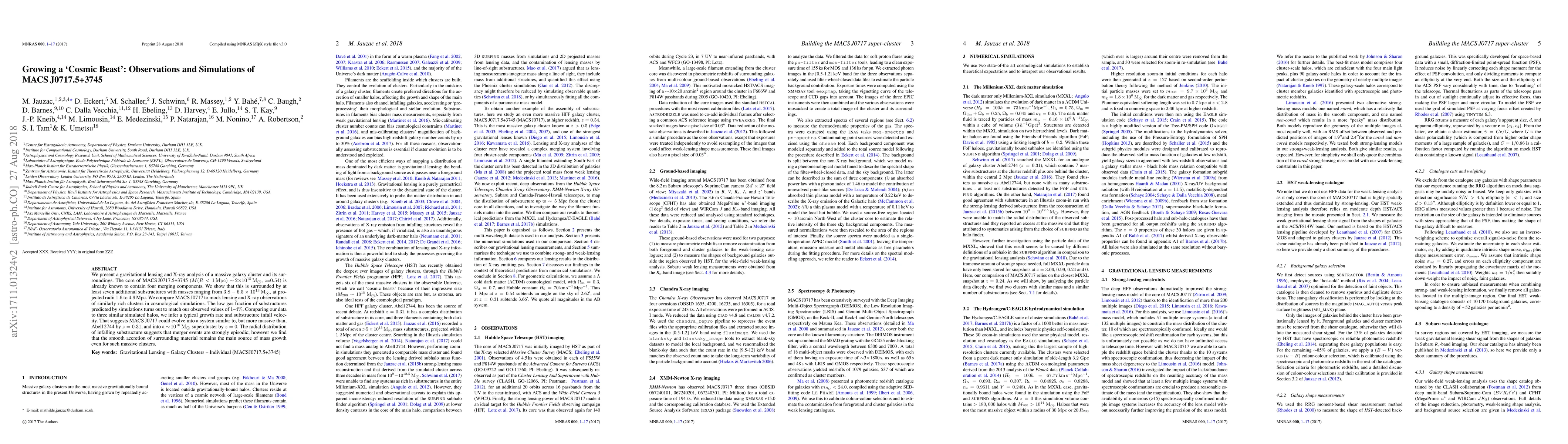 We present a gravitational lensing and X-ray analysis of a massive galaxy cluster and its surroundings. The core of MACS\,J0717.5+3745 ($M(R<1\,{\rm Mpc})\sim$\,$2$$\times$$10^{15}\,\msun$, $z$=$0.54$) is already known to contain four merging components. We show that this is surrounded by at least seven additional substructures with masses ranging from $3.8-6.5\times10^{13}\,\msun$, at projected radii $1.6$ to $4.9$\,Mpc. We compare MACS\,J0717 to mock lensing and X-ray observations of similarly rich clusters in cosmological simulations. The low gas fraction of substructures predicted by simulations turns out to match our observed values of $1$--$4\%$. Comparing our data to three similar simulated halos, we infer a typical growth rate and substructure infall velocity. That suggests MACS\,J0717 could evolve into a system similar to, but more massive than, Abell\,2744 by $z=0.31$, and into a $\sim$\,$10^{16}\,\msun$ supercluster by $z=0$. The radial distribution of infalling substructure suggests that merger events are strongly episodic; however we find that the smooth accretion of surrounding material remains the main source of mass growth even for such massive clusters.