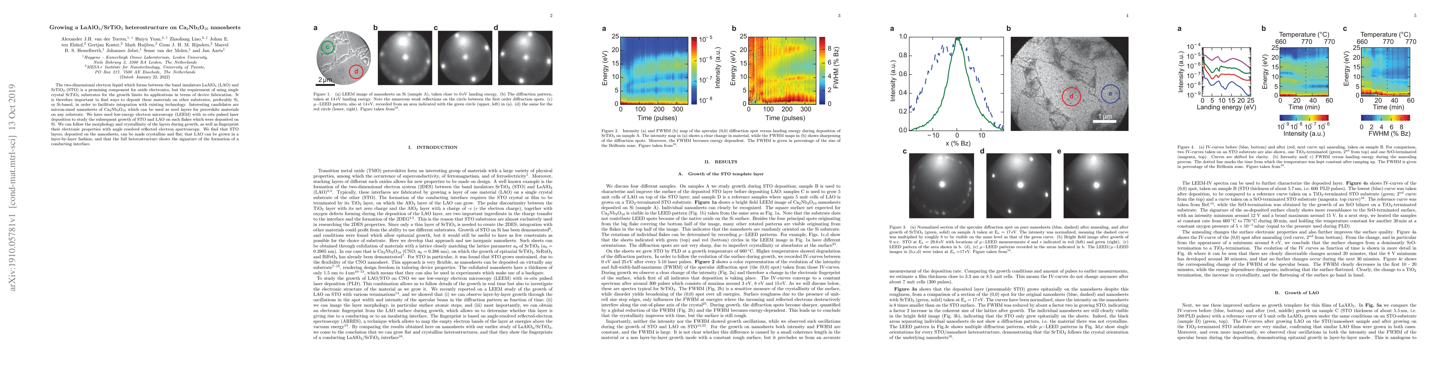 The two-dimensional electron liquid which forms between the band insulators LaAlO3 (LAO) and SrTiO3 (STO) is a promising component for oxide electronics, but the requirement of using single crystal SrTiO3 substrates for the growth limits its applications in terms of device fabrication. It is therefore important to find ways to deposit these materials on other substrates, preferably Si, or Si-based, in order to facilitate integration with existing technology. Interesting candidates are micron-sized nanosheets of Ca2Nb3O10 which can be used as seed layers for perovskite materials on any substrate. We have used low-energy electron microscopy (LEEM) with in-situ pulsed laser deposition to study the subsequent growth of STO and LAO on such flakes which were deposited on Si. We can follow the morphology and crystallinity of the layers during growth, as well as fingerprint their electronic properties with angle resolved reflected electron spectroscopy. We find that STO layers, deposited on the nanosheets, can be made crystalline and flat; that LAO can be grown in a layer-by-layer fashion; and that the full heterostructure shows the signature of the formation of a conducting interface.