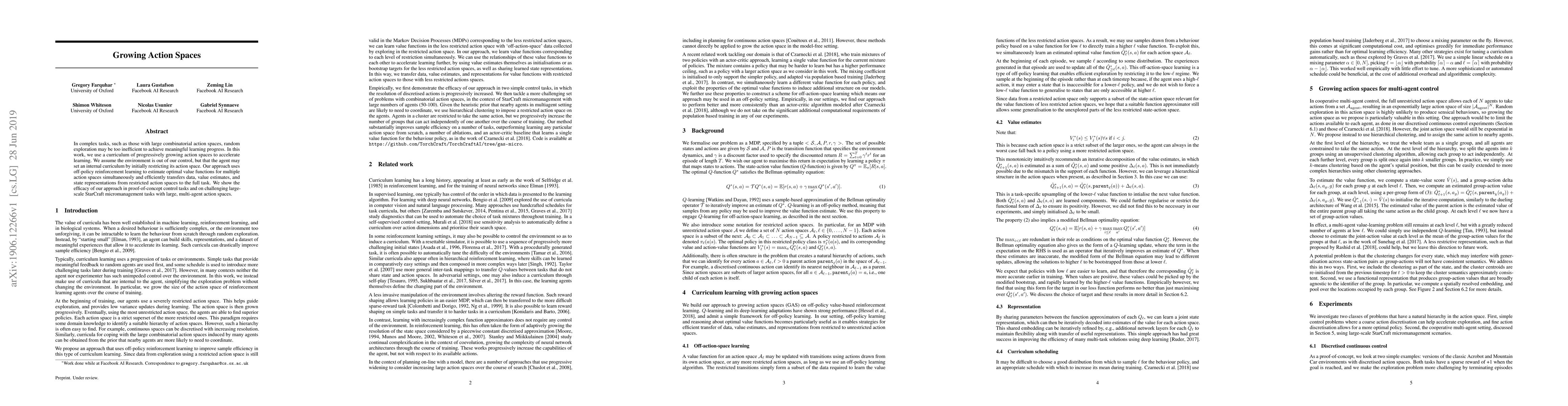 In complex tasks, such as those with large combinatorial action spaces, random exploration may be too inefficient to achieve meaningful learning progress. In this work, we use a curriculum of progressively growing action spaces to accelerate learning. We assume the environment is out of our control, but that the agent may set an internal curriculum by initially restricting its action space. Our approach uses off-policy reinforcement learning to estimate optimal value functions for multiple action spaces simultaneously and efficiently transfers data, value estimates, and state representations from restricted action spaces to the full task. We show the efficacy of our approach in proof-of-concept control tasks and on challenging large-scale StarCraft micromanagement tasks with large, multi-agent action spaces.