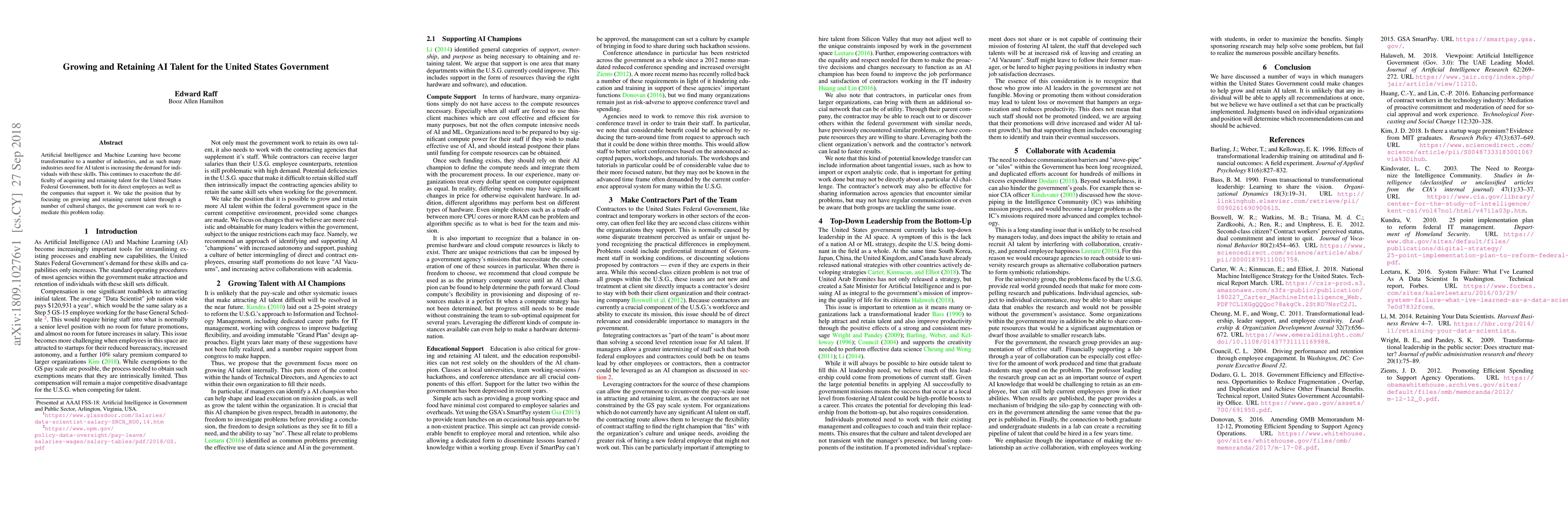 Artificial Intelligence and Machine Learning have become transformative to a number of industries, and as such many industries need for AI talent is increasing the demand for individuals with these skills. This continues to exacerbate the difficulty of acquiring and retaining talent for the United States Federal Government, both for its direct employees as well as the companies that support it. We take the position that by focusing on growing and retaining current talent through a number of cultural changes, the government can work to remediate this problem today.