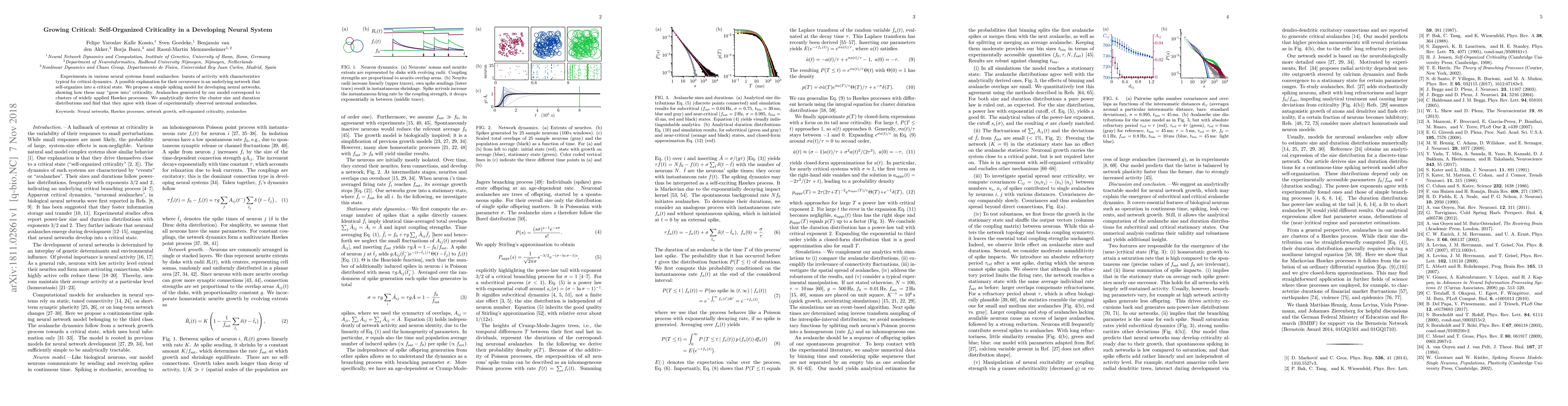 Experiments in various neural systems found avalanches: bursts of activity with characteristics typical for critical dynamics. A possible explanation for their occurrence is an underlying network that self-organizes into a critical state. We propose a simple spiking model for developing neural networks, showing how these may "grow into" criticality. Avalanches generated by our model correspond to clusters of widely applied Hawkes processes. We analytically derive the cluster size and duration distributions and find that they agree with those of experimentally observed neuronal avalanches.