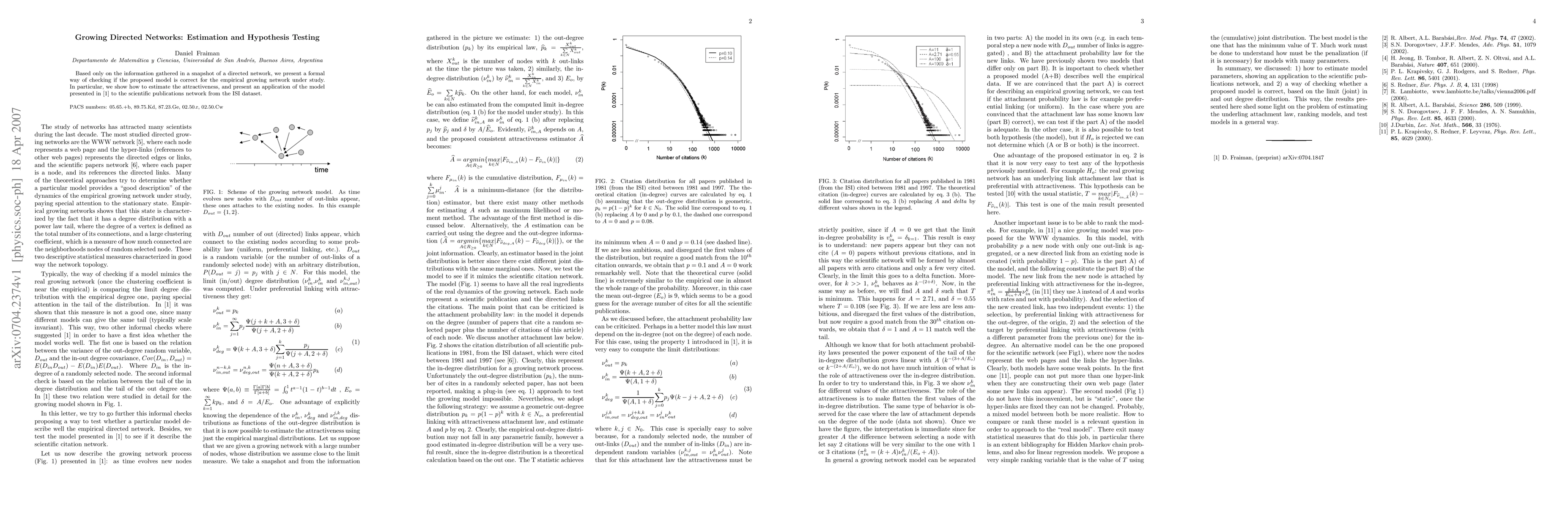 Based only on the information gathered in a snapshot of a directed network, we present a formal way of checking if the proposed model is correct for the empirical growing network under study. In particular, we show how to estimate the attractiveness, and present an application of the model presented in [arxiv:0704.1847] to the scientific publications network from the ISI dataset.
