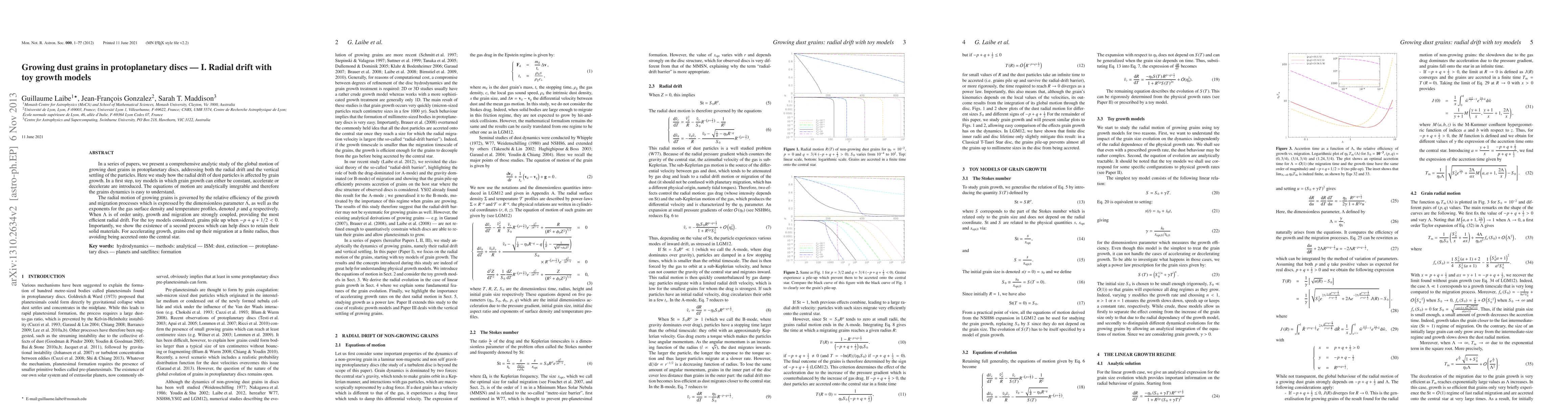 In a series of papers, we present a comprehensive analytic study of the global motion of growing dust grains in protoplanetary discs, addressing both the radial drift and the vertical settling of the particles. Here we study how the radial drift of dust particles is affected by grain growth. In a first step, toy models in which grain growth can either be constant, accelerate or decelerate are introduced. The equations of motion are analytically integrable and therefore the grains dynamics is easy to understand. The radial motion of growing grains is governed by the relative efficiency of the growth and migration processes which is expressed by the dimensionless parameter Lambda, as well as the exponents for the gas surface density and temperature profiles, denoted p and q respectively. When Lambda is of order unity, growth and migration are strongly coupled, providing the most efficient radial drift. For the toy models considered, grains pile up when -p+q+1/2<0. Importantly, we show the existence of a second process which can help discs to retain their solid materials. For accelerating growth, grains end up their migration at a finite radius, thus avoiding being accreted onto the central star.