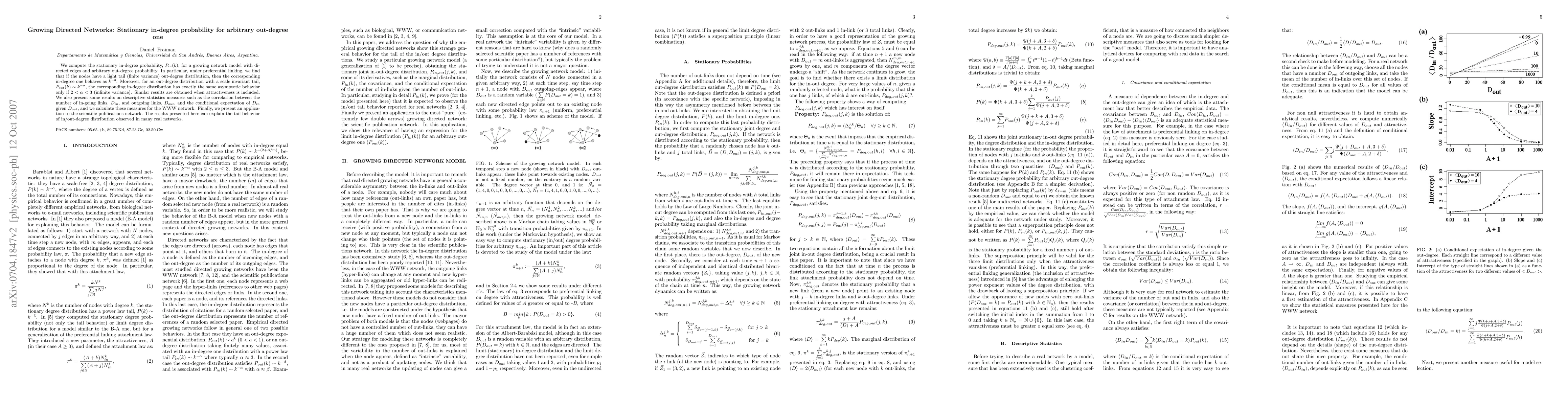 We compute the stationary in-degree probability, $P_{in}(k)$, for a growing network model with directed edges and arbitrary out-degree probability. In particular, under preferential linking, we find that if the nodes have a light tail (finite variance) out-degree distribution, then the corresponding in-degree one behaves as $k^{-3}$. Moreover, for an out-degree distribution with a scale invariant tail, $P_{out}(k)\sim k^{-\alpha}$, the corresponding in-degree distribution has exactly the same asymptotic behavior only if $2<\alpha<3$ (infinite variance). Similar results are obtained when attractiveness is included. We also present some results on descriptive statistics measures %descriptive statistics such as the correlation between the number of in-going links, $D_{in}$, and outgoing links, $D_{out}$, and the conditional expectation of $D_{in}$ given $D_{out}$, and we calculate these measures for the WWW network. Finally, we present an application to the scientific publications network. The results presented here can explain the tail behavior of in/out-degree distribution observed in many real networks.