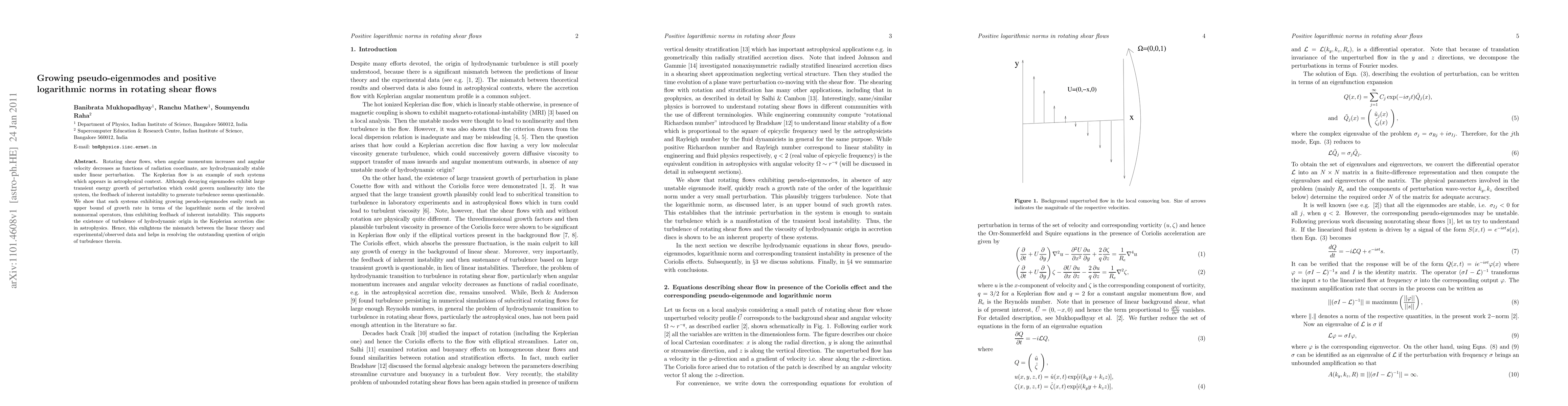 This paper investigates the hydrodynamic stability of rotating shear flows, demonstrating that despite initial transient energy growth, growing pseudo-eigenmodes and positive logarithmic norms indicate inherent instability capable of generating turbulence, thus resolving the discrepancy between linear theory and observed turbulence in astrophysical systems like Keplerian accretion discs.