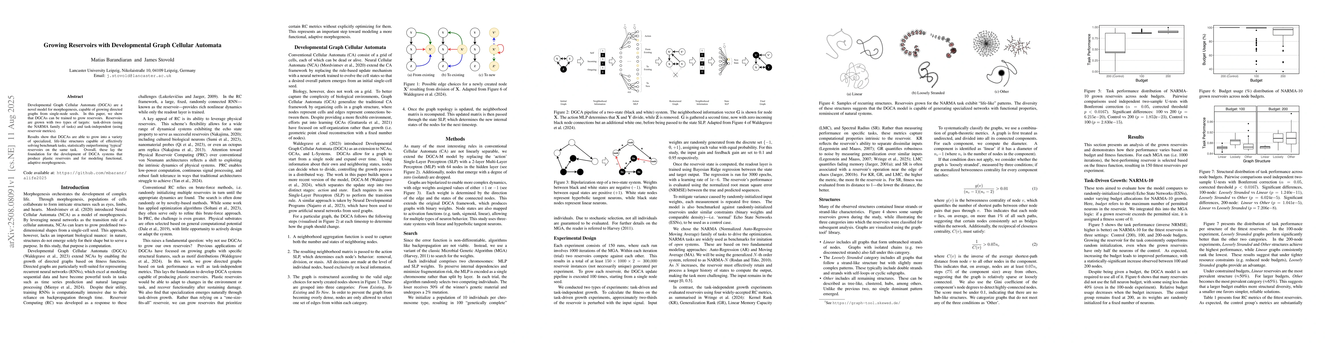 The paper introduces a method for growing reservoirs using DGCA, benchmarking them against increasingly difficult imitation tasks, and showcasing structural diversity in produced reservoirs.