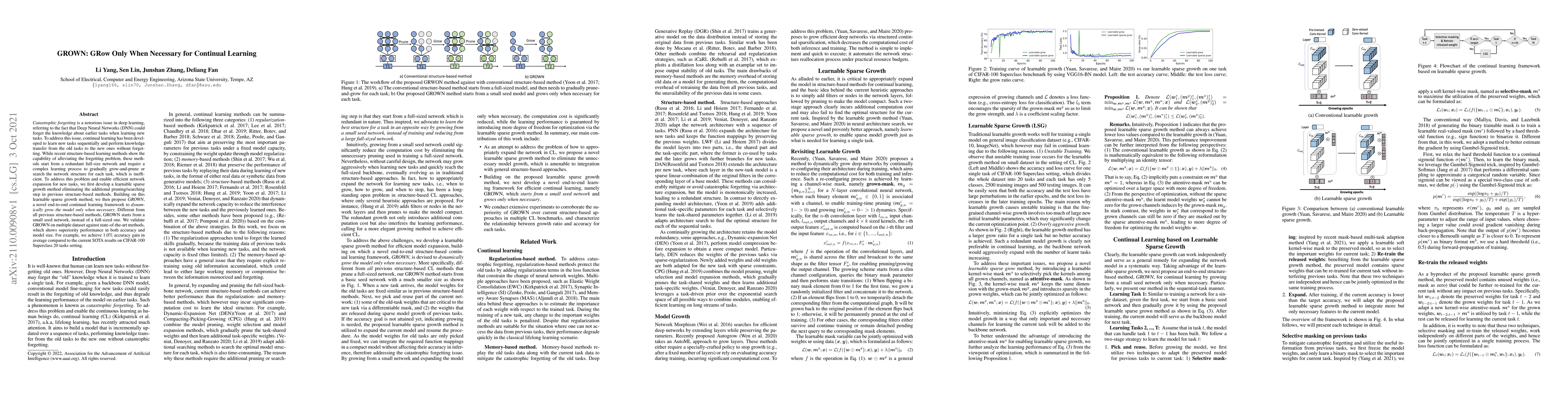Catastrophic forgetting is a notorious issue in deep learning, referring to the fact that Deep Neural Networks (DNN) could forget the knowledge about earlier tasks when learning new tasks. To address this issue, continual learning has been developed to learn new tasks sequentially and perform knowledge transfer from the old tasks to the new ones without forgetting. While recent structure-based learning methods show the capability of alleviating the forgetting problem, these methods start from a redundant full-size network and require a complex learning process to gradually grow-and-prune or search the network structure for each task, which is inefficient. To address this problem and enable efficient network expansion for new tasks, we first develop a learnable sparse growth method eliminating the additional pruning/searching step in previous structure-based methods. Building on this learnable sparse growth method, we then propose GROWN, a novel end-to-end continual learning framework to dynamically grow the model only when necessary. Different from all previous structure-based methods, GROWN starts from a small seed network, instead of a full-sized one. We validate GROWN on multiple datasets against state-of-the-art methods, which shows superior performance in both accuracy and model size. For example, we achieve 1.0\% accuracy gain on average compared to the current SOTA results on CIFAR-100 Superclass 20 tasks setting.