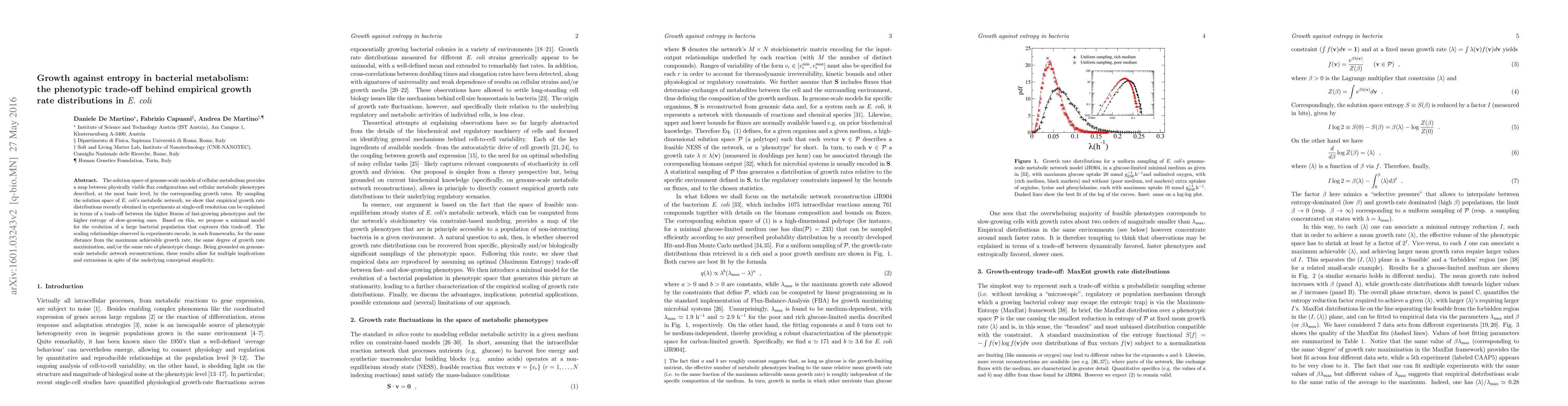 This paper explores how bacterial metabolism balances growth rate and entropy, demonstrating that empirical growth rate distributions in E. coli arise from a trade-off between fast-growing and slow-growing phenotypes. It proposes a minimal evolutionary model capturing this balance and highlights the implications of these findings for genome-scale metabolic networks.