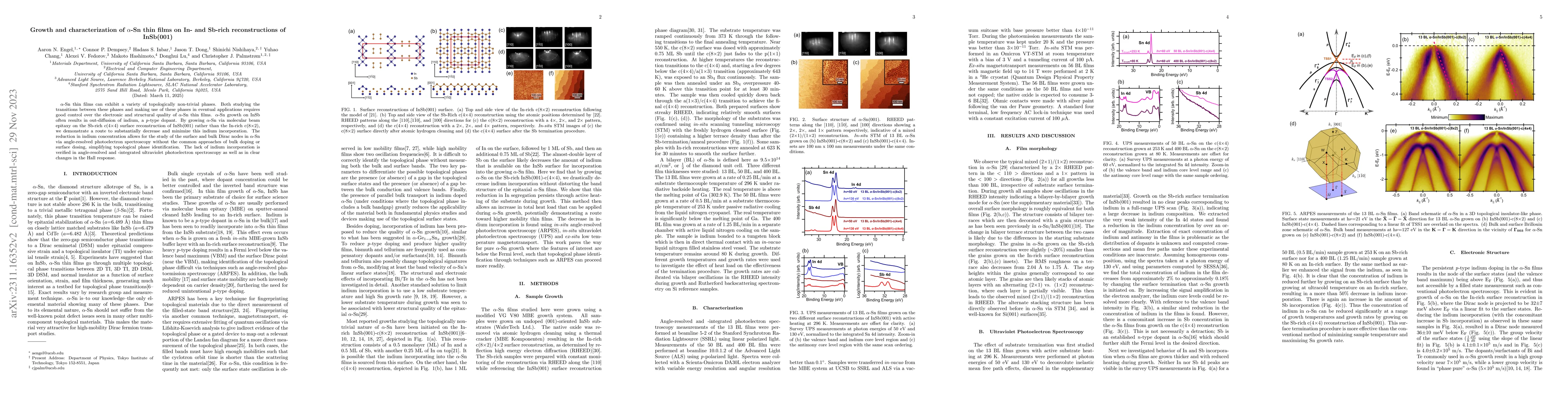 $\alpha$-Sn thin films can exhibit a variety of topologically non-trivial phases. Both studying the transitions between these phases and making use of these phases in eventual applications requires good control over the electronic and structural quality of $\alpha$-Sn thin films. $\alpha$-Sn growth on InSb often results in out-diffusion of indium, a p-type dopant. By growing $\alpha$-Sn via molecular beam epitaxy on the Sb-rich c(4$\times$4) surface reconstruction of InSb(001) rather than the In-rich c(8$\times$2), we demonstrate a route to substantially decrease and minimize this indium incorporation. The reduction in indium concentration allows for the study of the surface and bulk Dirac nodes in $\alpha$-Sn via angle-resolved photoelectron spectroscopy without the common approaches of bulk doping or surface dosing, simplifying topological phase identification. The lack of indium incorporation is verified in angle-resolved and -integrated ultraviolet photoelectron spectroscopy as well as in clear changes in the Hall response.