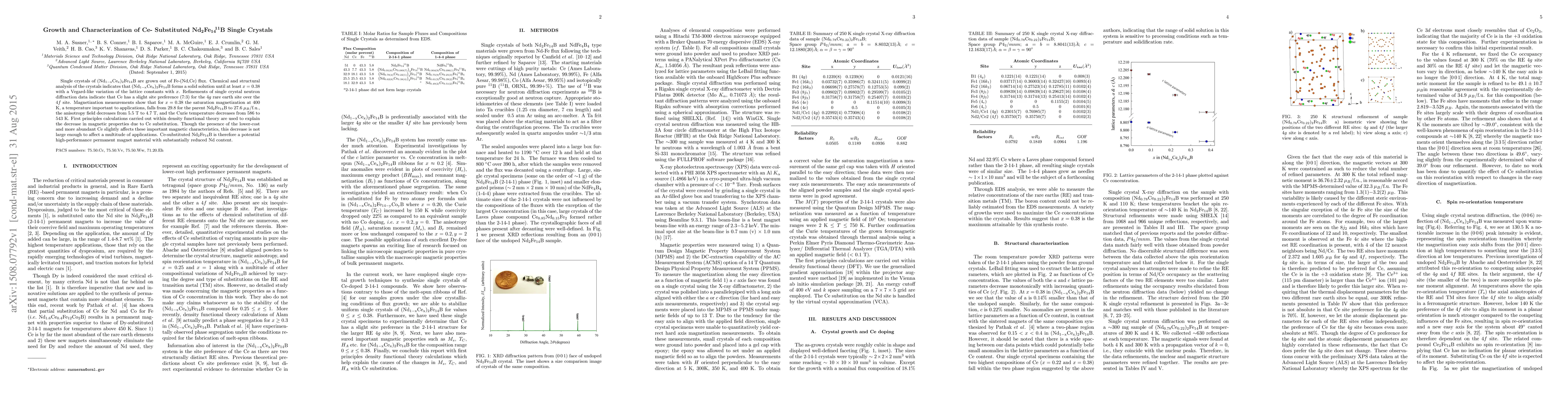 Single crystals of (Nd1-xCex)2Fe14B are grown out of Fe-(Nd,Ce) flux. Chemical and structural analysis of the crystals indicates that (Nd1-xCex)2Fe14B forms a solid solution until at least x = 0.38 with a Vegard-like variation of the lattice constants with x. Refinements of single crystal neutron diffraction data indicate that Ce has a slight site preference (7:3) for the 4g rare earth site over the 4f site. Magnetization measurements show that for x = 0.38 the saturation magnetization at 400 K, a temperature important to applications, falls from 29.8 for the parent Nd2Fe14B to 27.6 (mu)B/f.u., the anisotropy field decreases from 5.5 T to 4.7 T, and the Curie temperature decreases from 586 to 543 K. First principles calculations carried out within density functional theory are used to explain the decrease in magnetic properties due to Ce substitution. Though the presence of the lower-cost and more abundant Ce slightly affects these important magnetic characteristics, this decrease is not large enough to affect a multitude of applications. Ce-substituted Nd2Fe14B is therefore a potential high-performance permanent magnet material with substantially reduced Nd content.