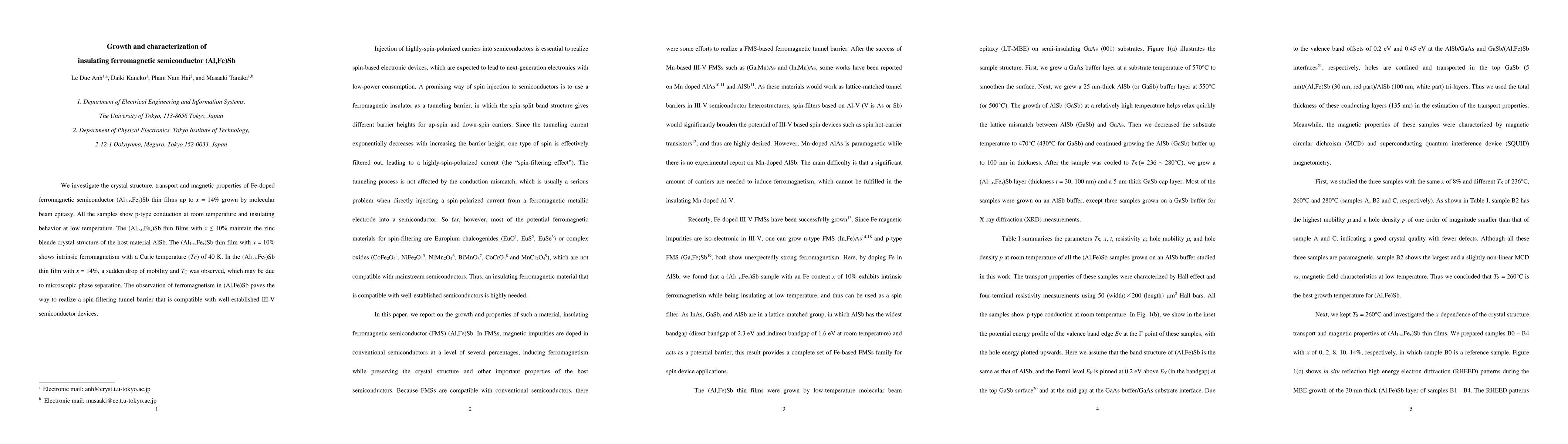 This study investigates the crystal structure, transport, and magnetic properties of Fe-doped (Al,Fe)Sb thin films, revealing intrinsic ferromagnetism at low Fe concentrations and potential for spin-filtering applications. The films show p-type conduction and insulating behavior at low temperatures, with a Curie temperature of 40 K for x = 10%.