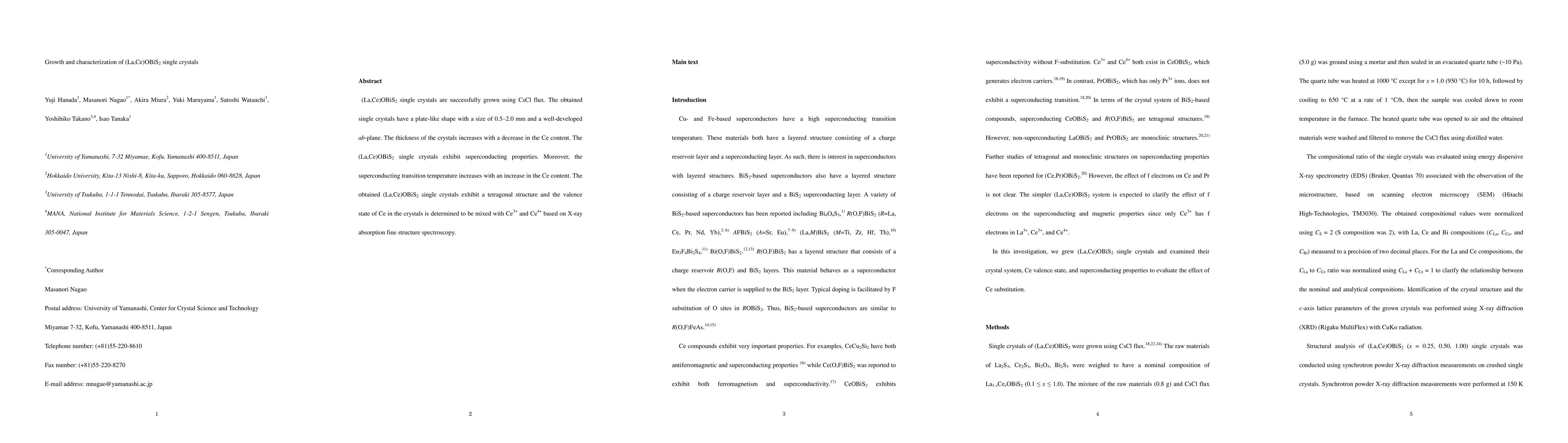 The research paper details the successful growth of (La,Ce)OBiS2 single crystals using CsCl flux, revealing a plate-like shape and a tetragonal structure. The crystals exhibit superconducting properties with a transition temperature that increases with higher Ce content, attributed to a mixed valence state of Ce3+ and Ce4+.