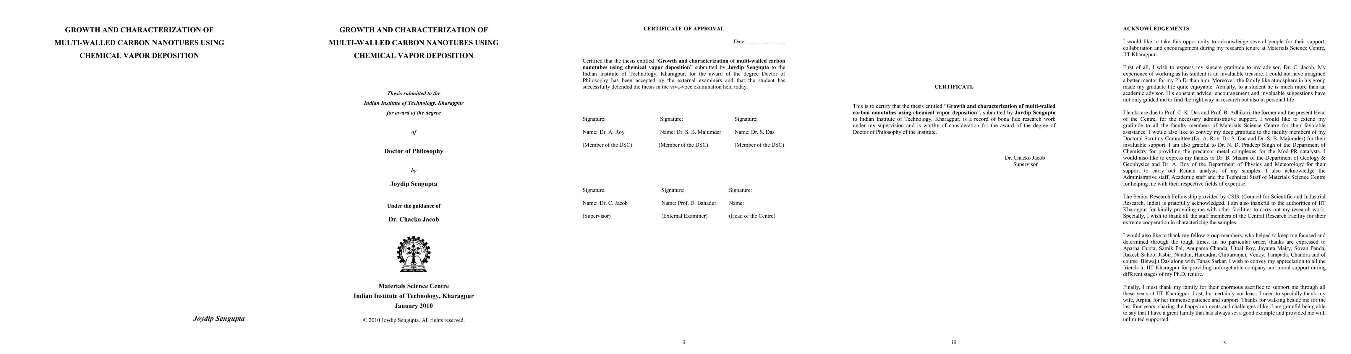 In this study, the synthesis of multi-walled carbon nanotubes (MWCNTs) was carried out by chemical vapor deposition (CVD) using propane as the carbon source and Si as the catalyst support. The effect of CVD process variables such as temperature, choice of catalyst, etc on the growth behavior of nanotubes has been examined to understand the catalytic growth of CNTs. The transition metal catalysts, Fe and Ni, were used in both elemental metal form and in a metal complex form. In the case of elemental metal catalysts, the respective metals were deposited over the Si substrate using thermal evaporation following which nanotubes were synthesized by means of CVD. Subsequent studies of the synthesized carbon nanostructures employing elemental metal catalysts revealed a significant influence of the temperature and the catalyst material on the structure of CNTs. The CNTs synthesized using Ni catalyst were bamboo-like whereas the CNTs developed employing Fe catalyst were straight tubes with partial metal filling. Consequently, growth models for the different growth mechanisms have been proposed. Certain limitations of the above process have been overcome by employing spin-coating of a metal complex catalyst material on the Si substrate. The CVD synthesis of nanotubes using metal complex catalysts always resulted in partially catalyst filled CNTs. More importantly, the metal complex catalyst could be easily patterned on the Si substrate using spin-coating and photolithography, which resulted in site selective growth of partially catalyst filled MWCNTs. Since the entire process of site selective growth is suitable for conventional device fabrication, this method is a promising and practical pathway for large-scale fabrication of several magnetic material filled CNT-based devices.