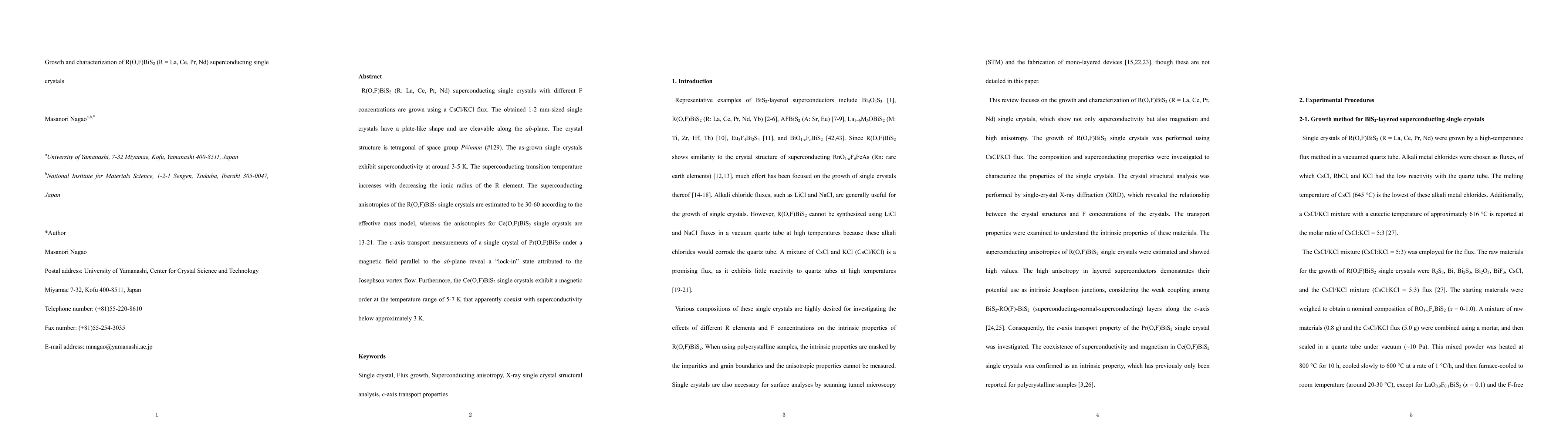 This study investigates the growth and characterization of R(O,F)BiS2 (R = La, Ce, Pr, Nd) superconducting single crystals, revealing that they exhibit superconductivity at around 3-5 K with varying transition temperatures depending on the R element's ionic radius. The crystals show tetragonal structure and superconducting anisotropies in the range of 30-60, with notable Josephson vortex flow and coexisting magnetic order in Ce(O,F)BiS2.